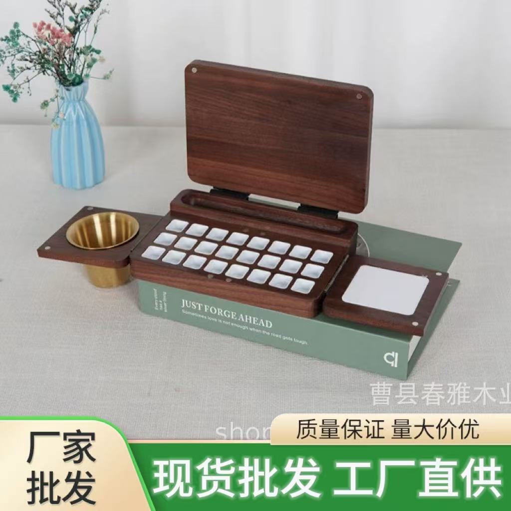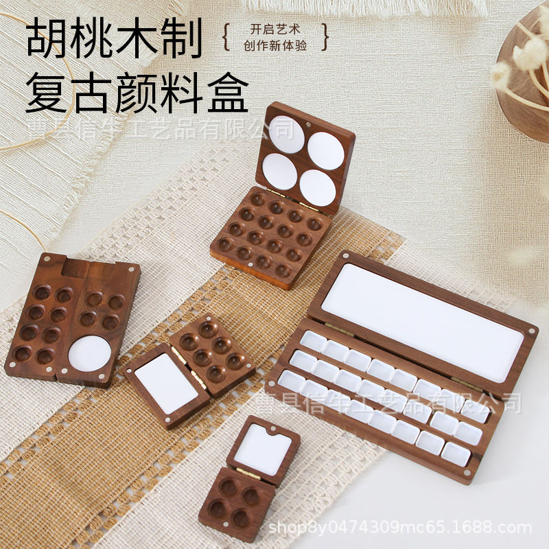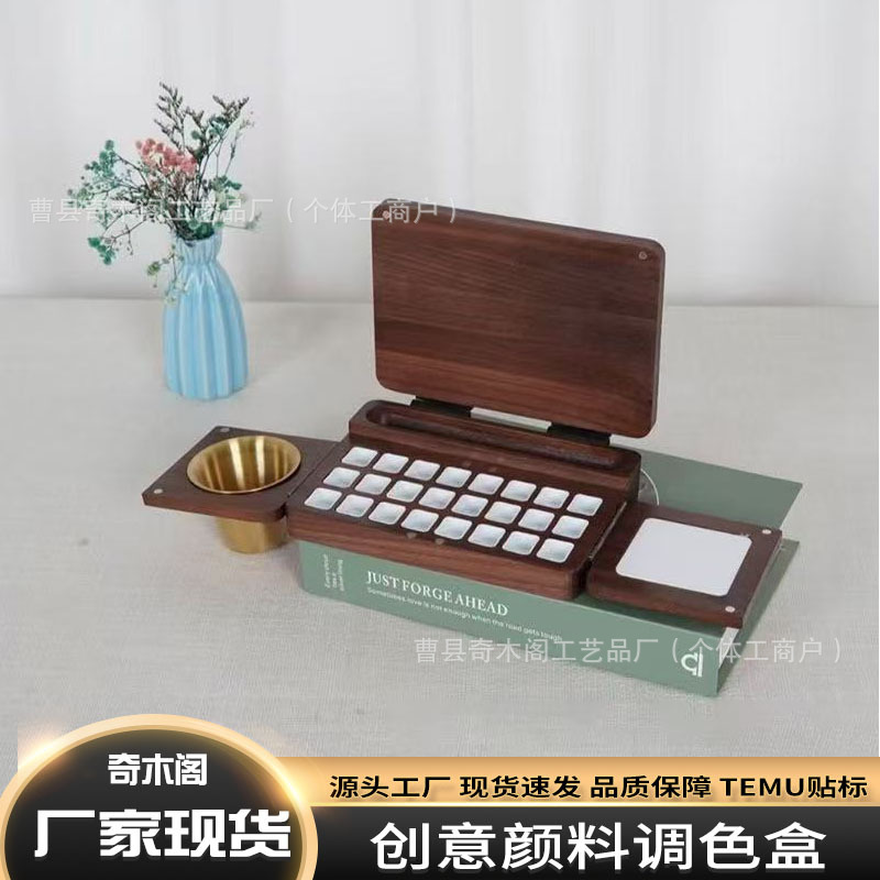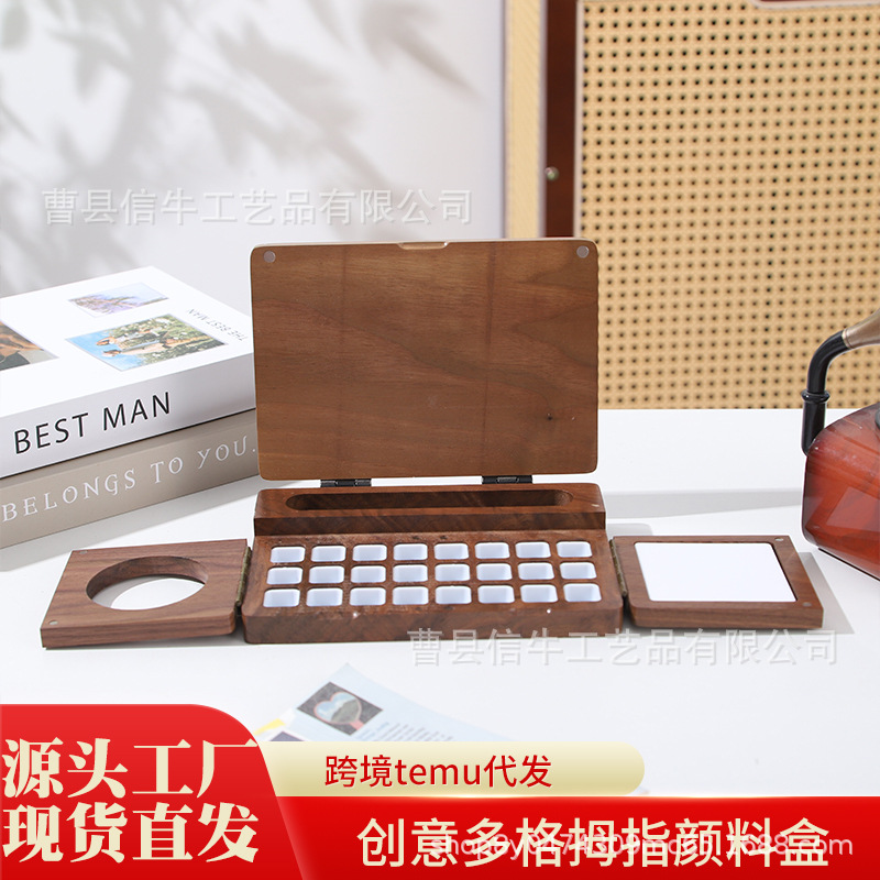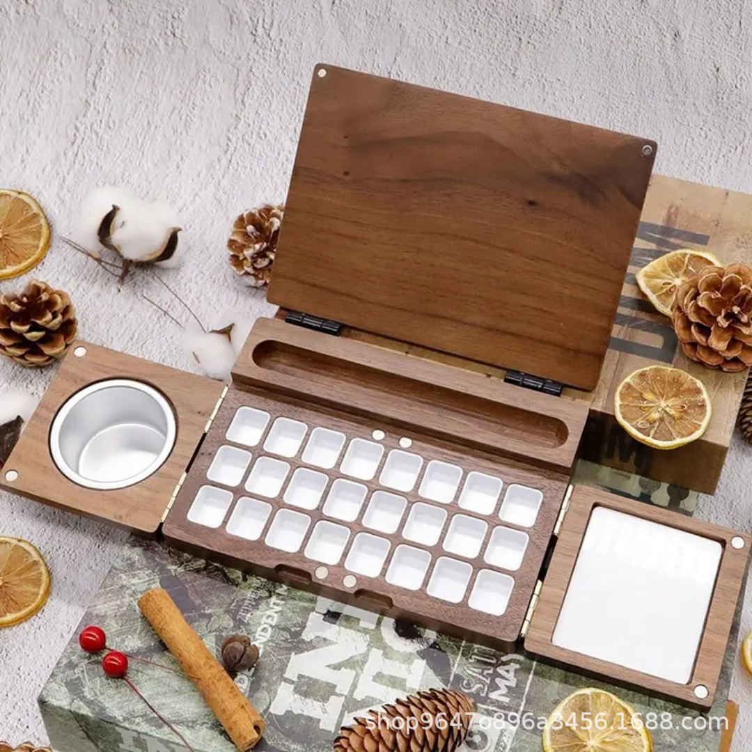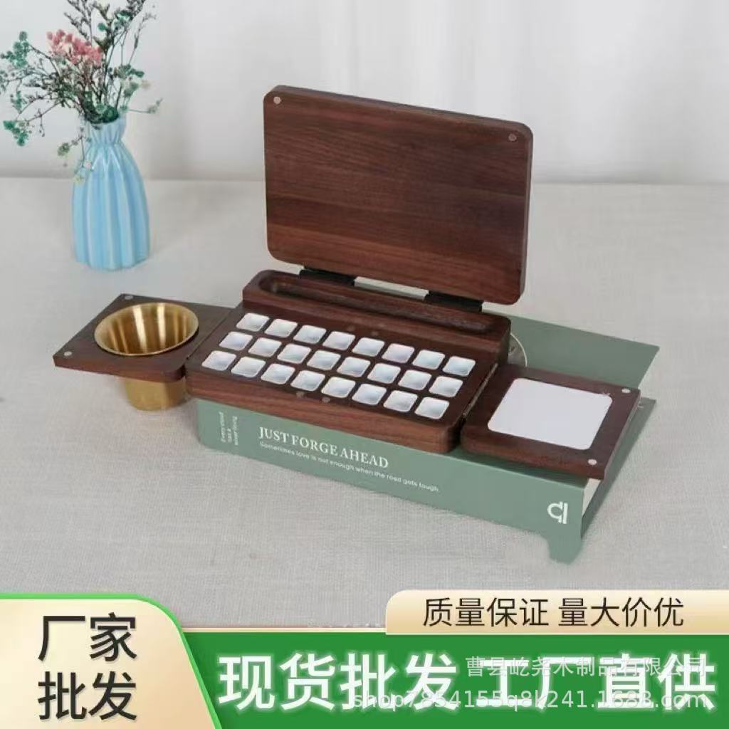 现货黑胡桃木可折叠颜料盒旅行木制调色盘美甲彩绘多格实木颜料盒