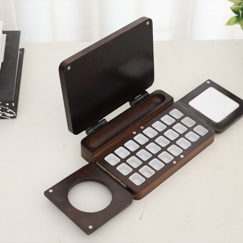 三つ折り水彩絵画ボードポータブル木製旅行絵画ボックス無垢材24色丸穴水彩分格パレット