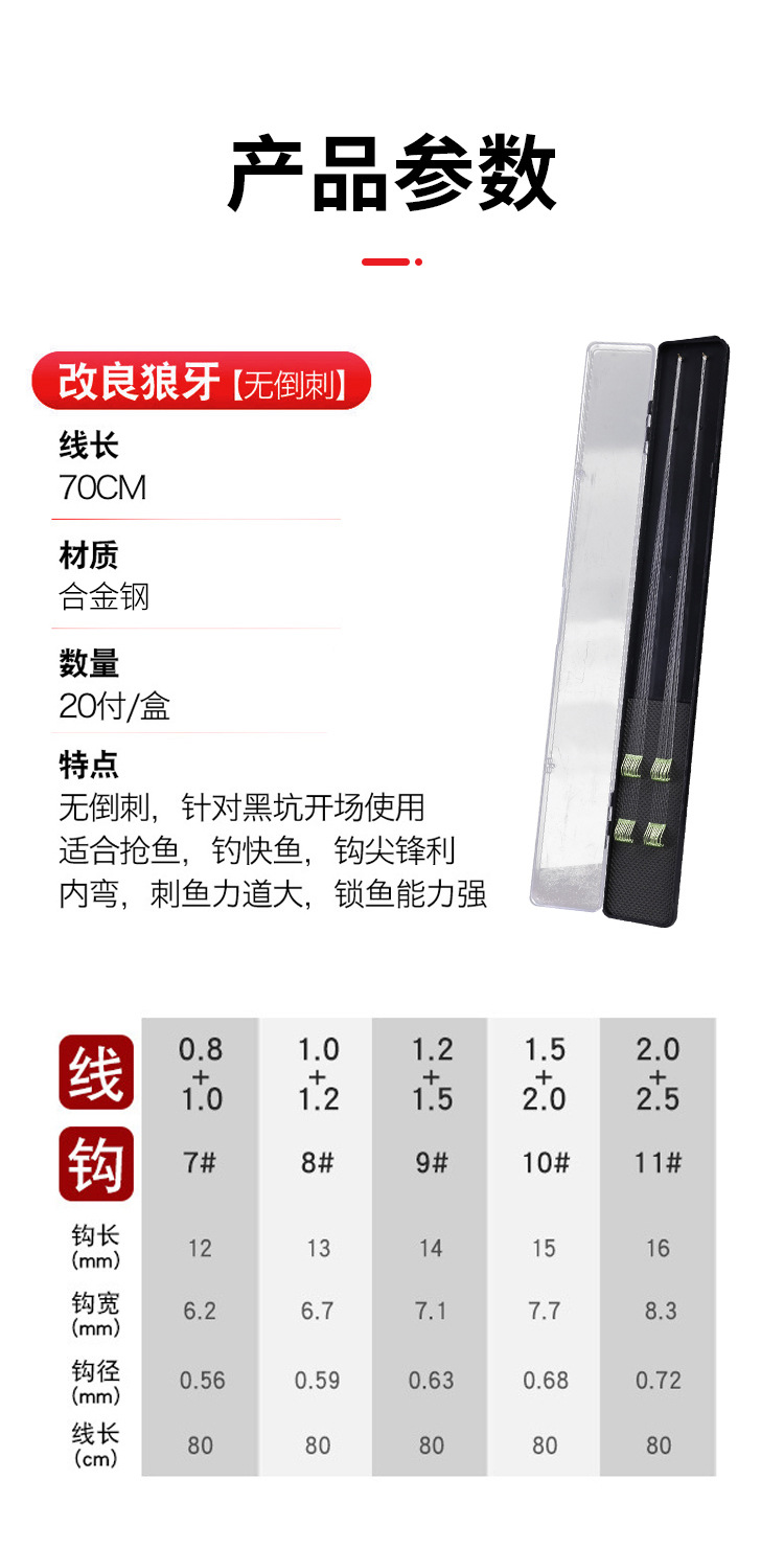 改良された狼の牙: 6# 線径:0.3,改良ウルフファング 6#―線径0.4,改良ウルフファング 6#―線径0.6,改良ウルフファング 6#―線径0.8,改良ウルフファング 6#—線径1.0,改良ウルフファング 7#―線径0.4,改良ウルフファング 7#―線径0.6,改良ウルフファング 7#―線径0.8,改良ウルフファング 7#—線径1.0,改良ウルフファング 7#―線径1.2,改良ウルフファング 7#—線径1.5,改良ウルフファング 7#―線径2.0,改良ウルフファング 8#―線径0.6,改良ウルフファング 8#―線径0.8,改良ウルフファング 8#—線径1.0,改良ウルフファング 8#―線径1.2,改良ウルフファング 8#—線径1.5,改良ウルフファング 8#―線径2.0,改良されたウルフファング 9#—線径1.0,改良されたウルフファング 9#―線径1.2,改良されたウルフファング 9#—線径1.5,改良されたウルフファング 9#―線径2.0,改良されたウルフファング 10#―線径0.8,改良されたウルフファング 10#—線径1.0,改良されたウルフファング 10#―線径1.2,改良されたウルフファング 10#—線径1.5,改良されたウルフファング 10#―線径2.0,改良されたウルフファング 10#—線径2.5
