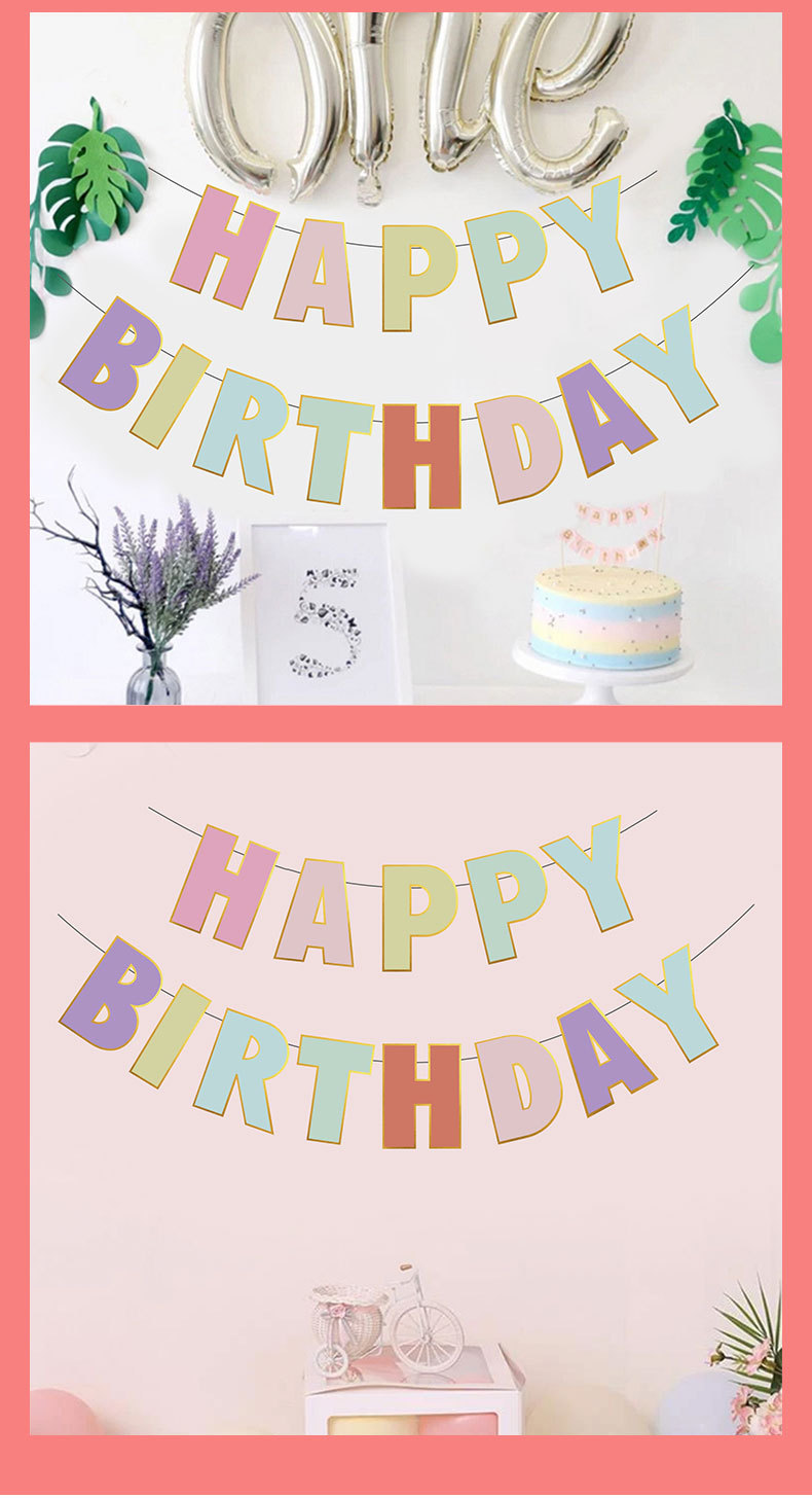 マカロン色の箔押し誕生日おめでとうアルファベットの旗誕生日パーティーの背景壁に飾り棒卸売りを配置する