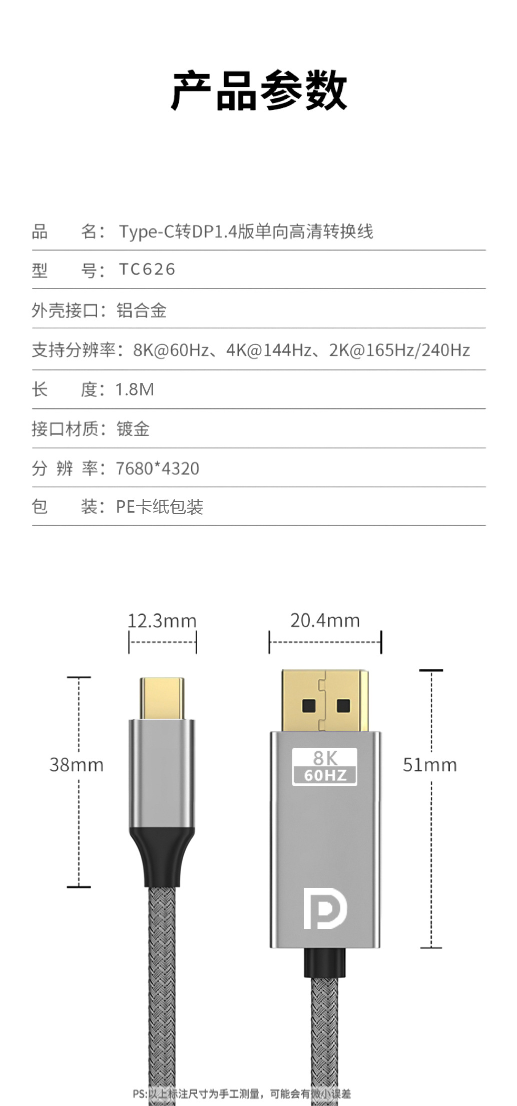 Typec转dp转接线8K60HZ 4K144Hz 手机笔记本投屏typec转dp高清线