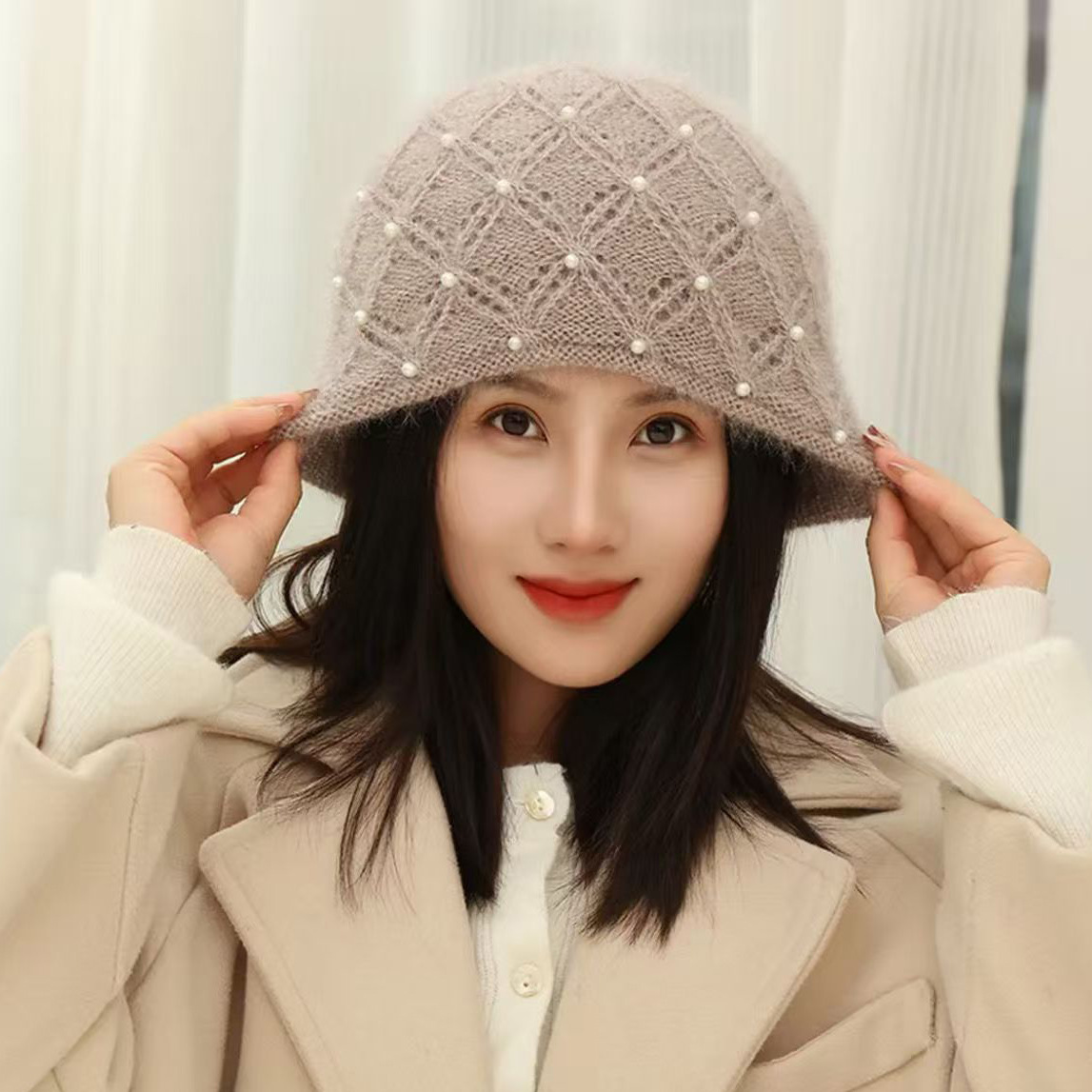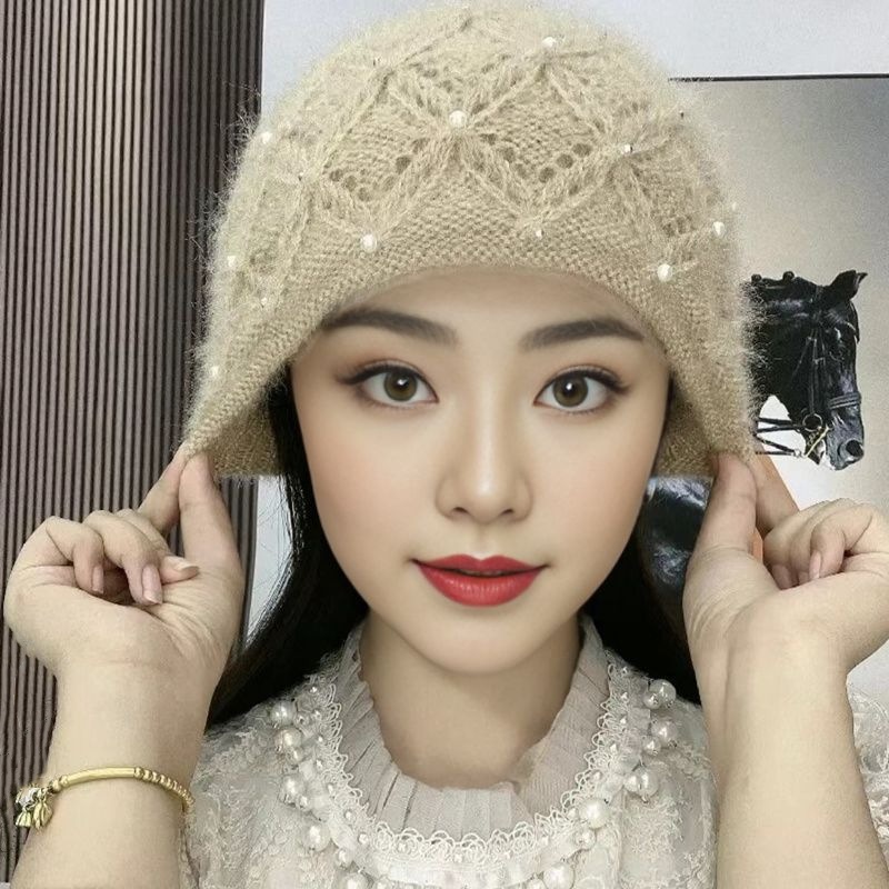手工双层保暖针织帽时尚珍珠头套护耳包头帽堆堆帽简约冬季帽子女