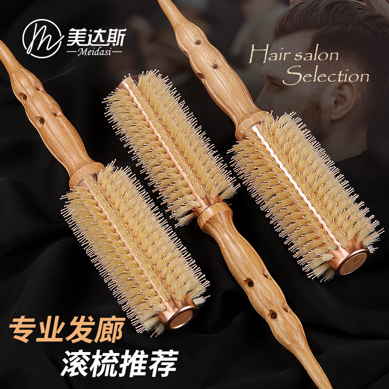 韩国猪鬃毛卷发梳理发店蓬松造型梳榉木手柄耐热铝管圆筒滚梳子