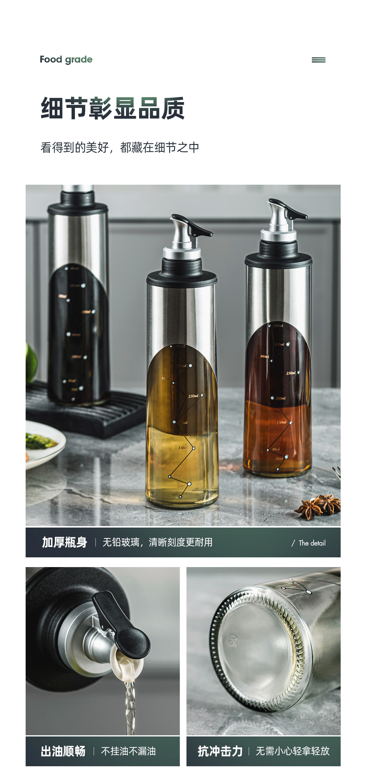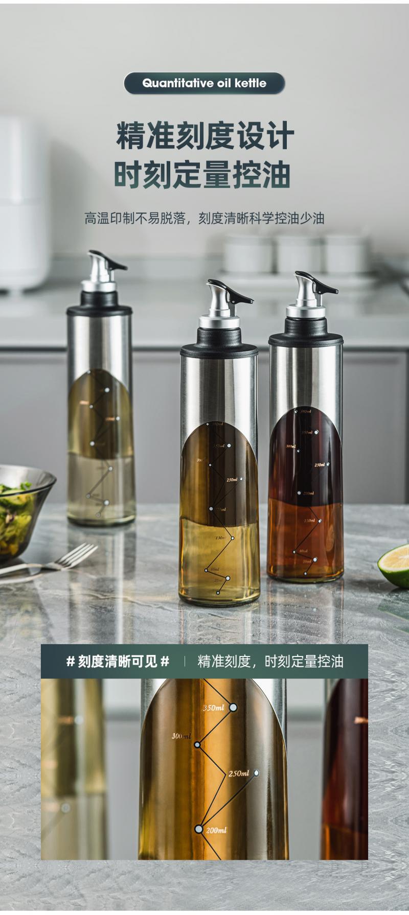 スケール付きオイルポット、厚みのあるガラスオイルボトル、ステンレス製醤油酢調味料ボトル、家庭用キッチン密封漏れ防止オイルタンク