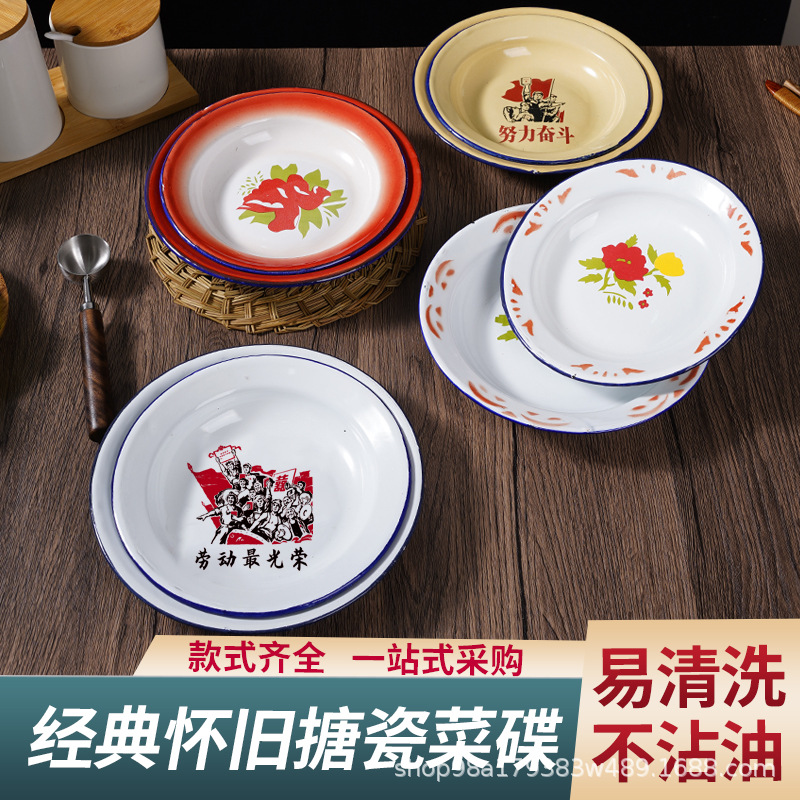 エナメルの皿の家庭用の古いレトロなレストランのホテルの特色の料理の大きい皿のニワトリの魚の磁器の皿の円形はお茶の皿に託します。