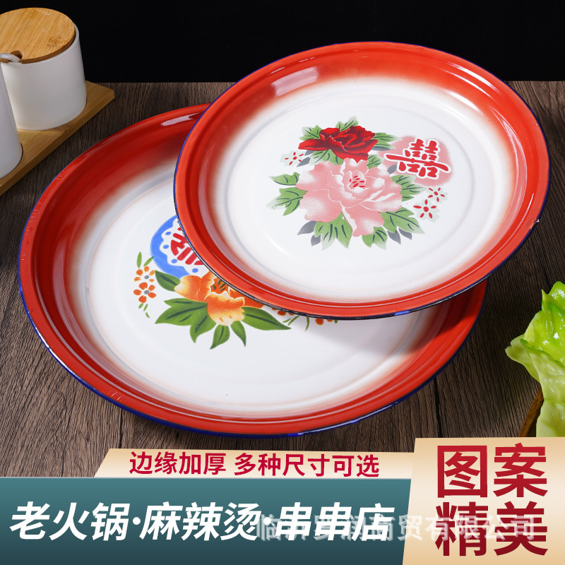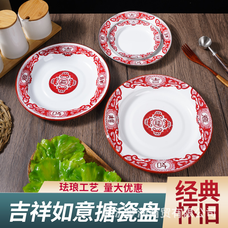 エナメルの皿は赤い吉祥如意の鍋のおかずの皿譚三娘の復古の皿の丸い料理の皿を厚くします。