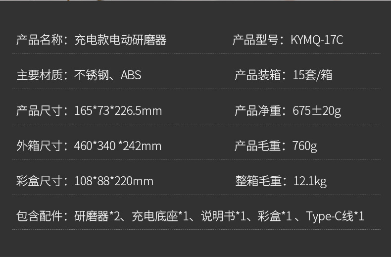 17C电动研磨器*2 +充电底座+充电线+彩盒