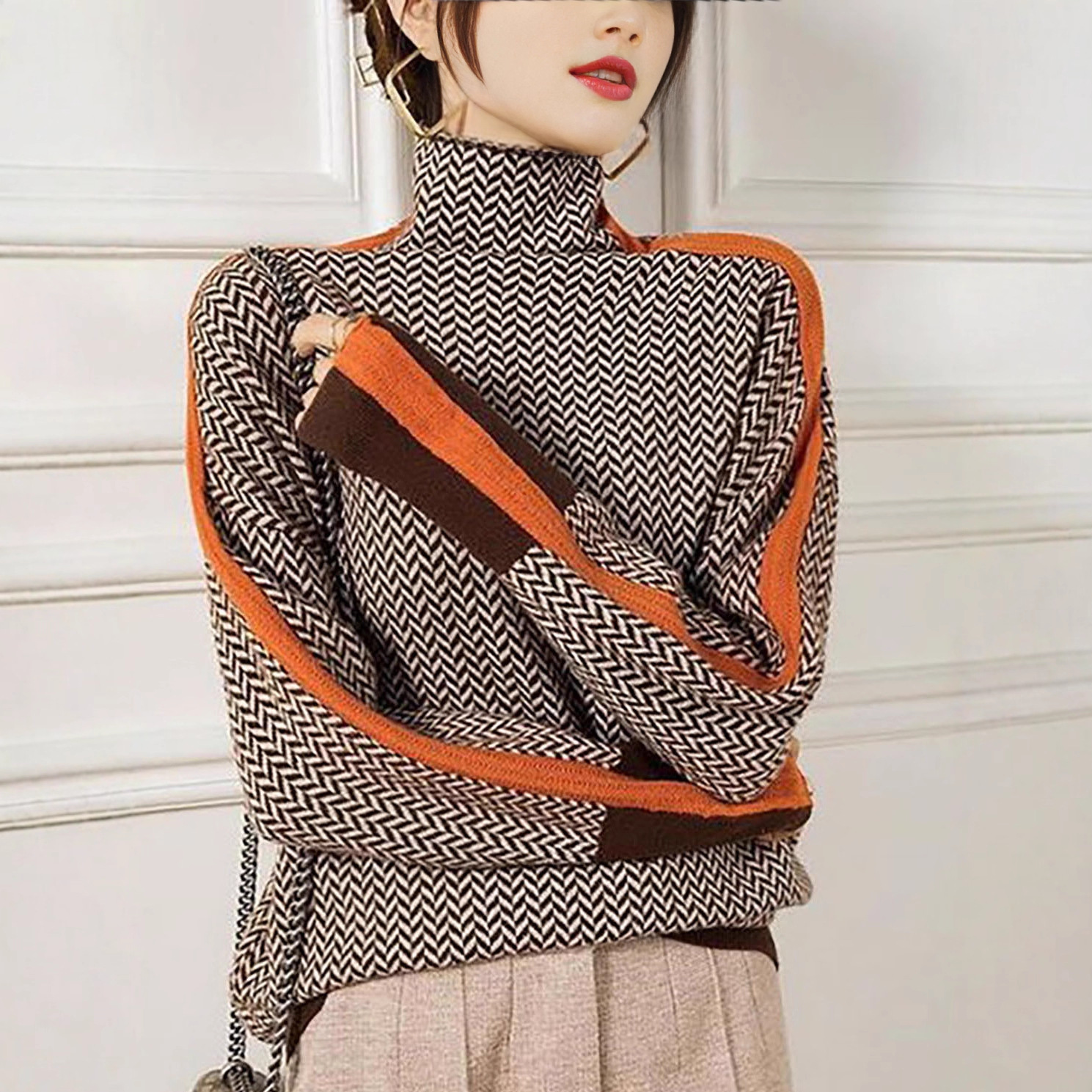 外贸跨境秋冬设计感慵懒宽松撞色袖全仿羊毛高领针织衫毛衣女秋冬