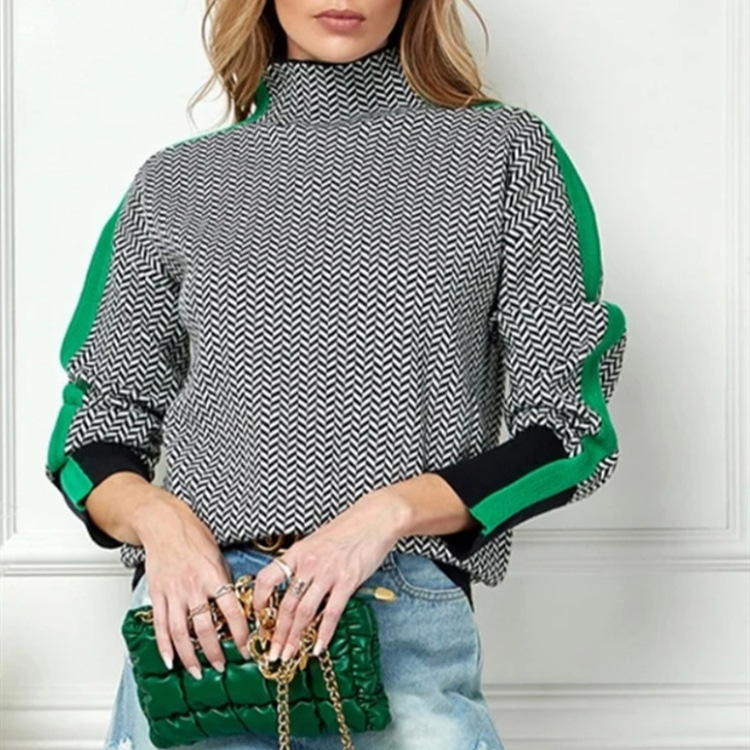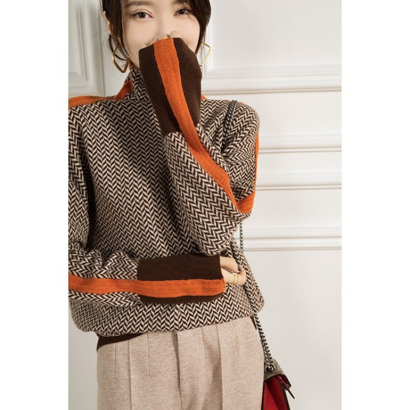 ヨーロッパ風ゆったりとしたカジュアルな襟付きイミテーションカシミヤセーター、秋冬用千鳥格子柄ハイネックセーター