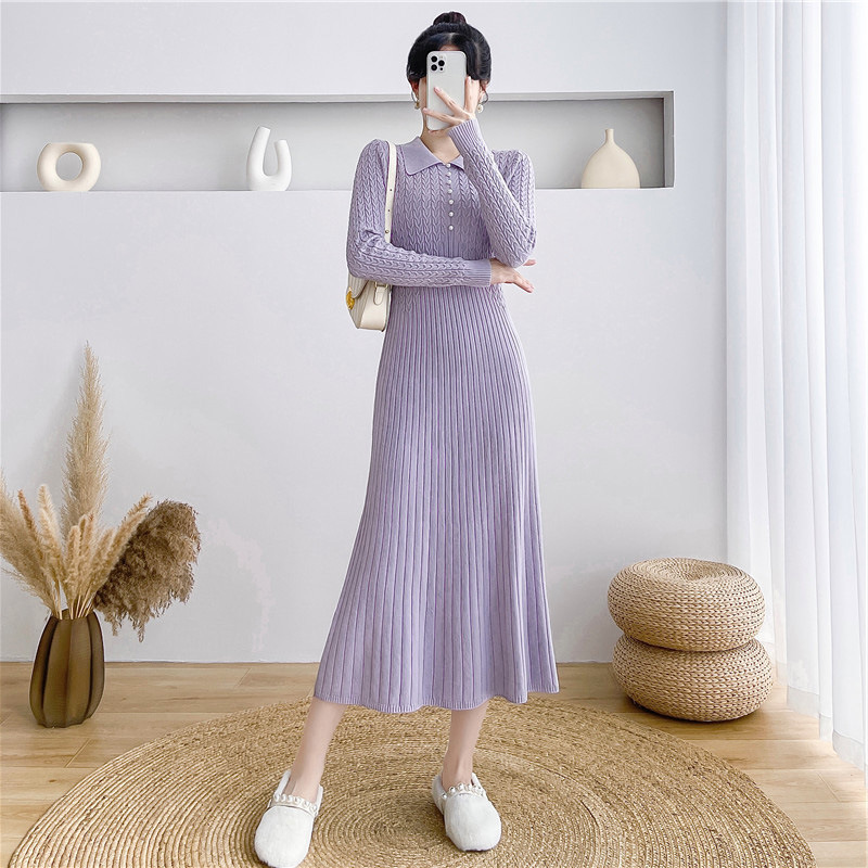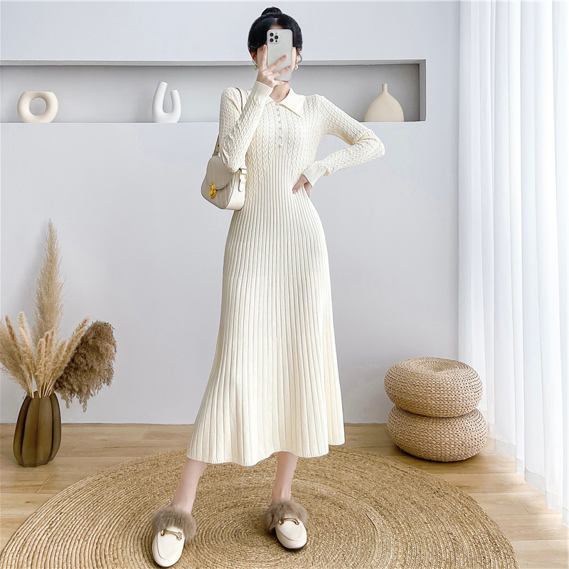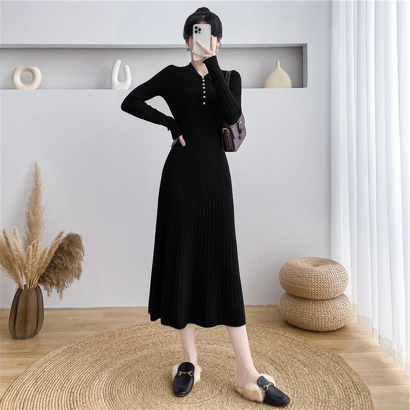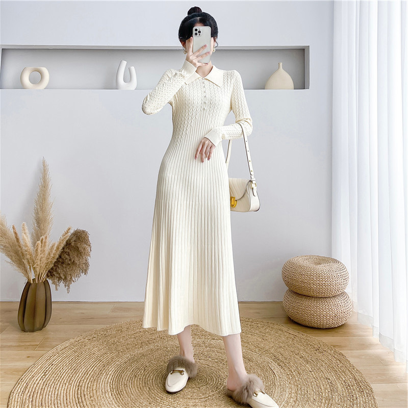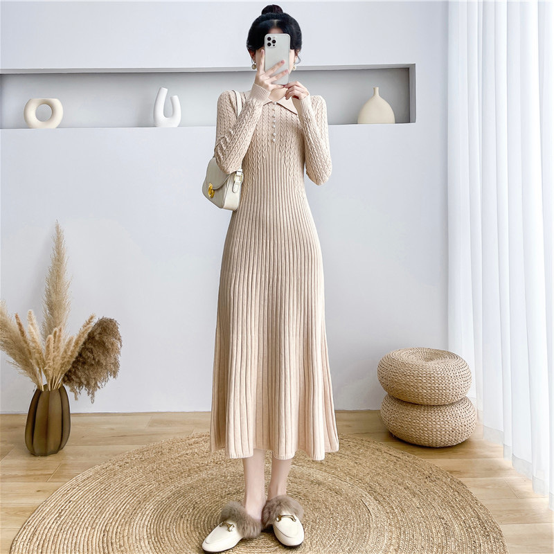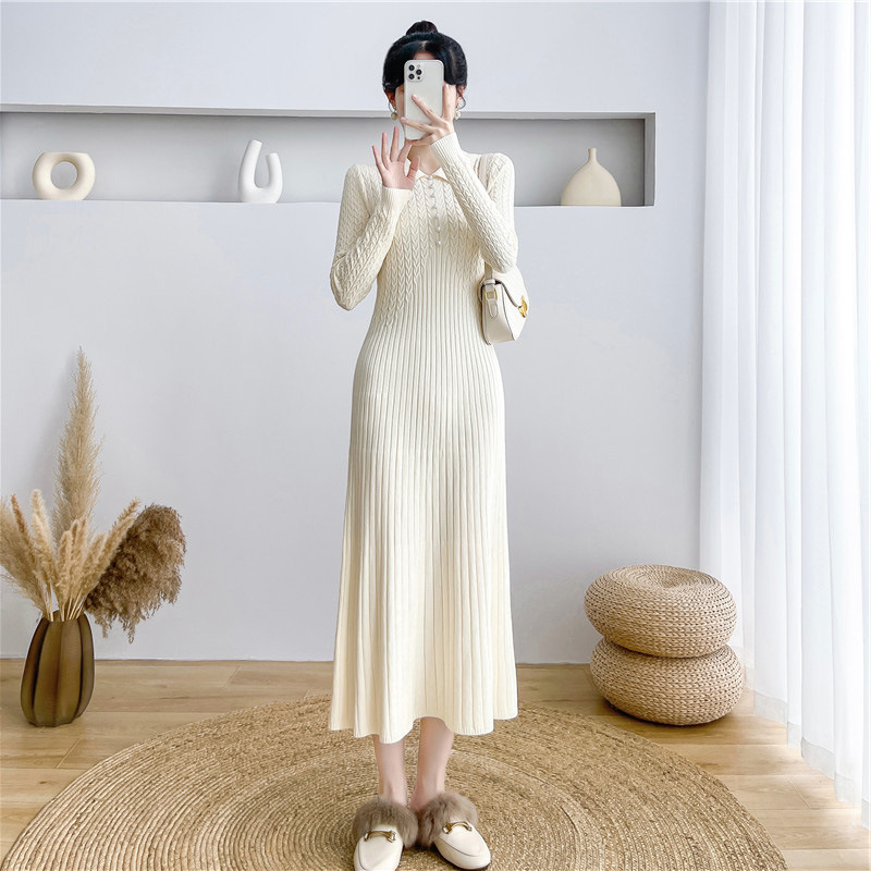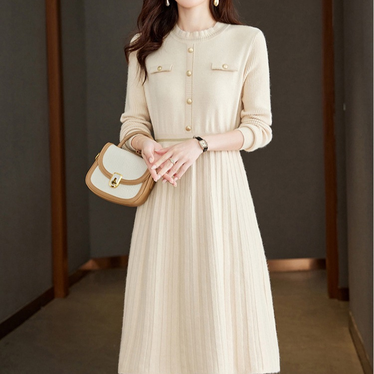 秋冬新款毛衣内搭圆领针织连衣裙女式纯色收腰宽松抽条气质中长裙