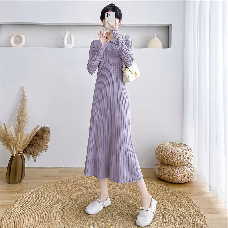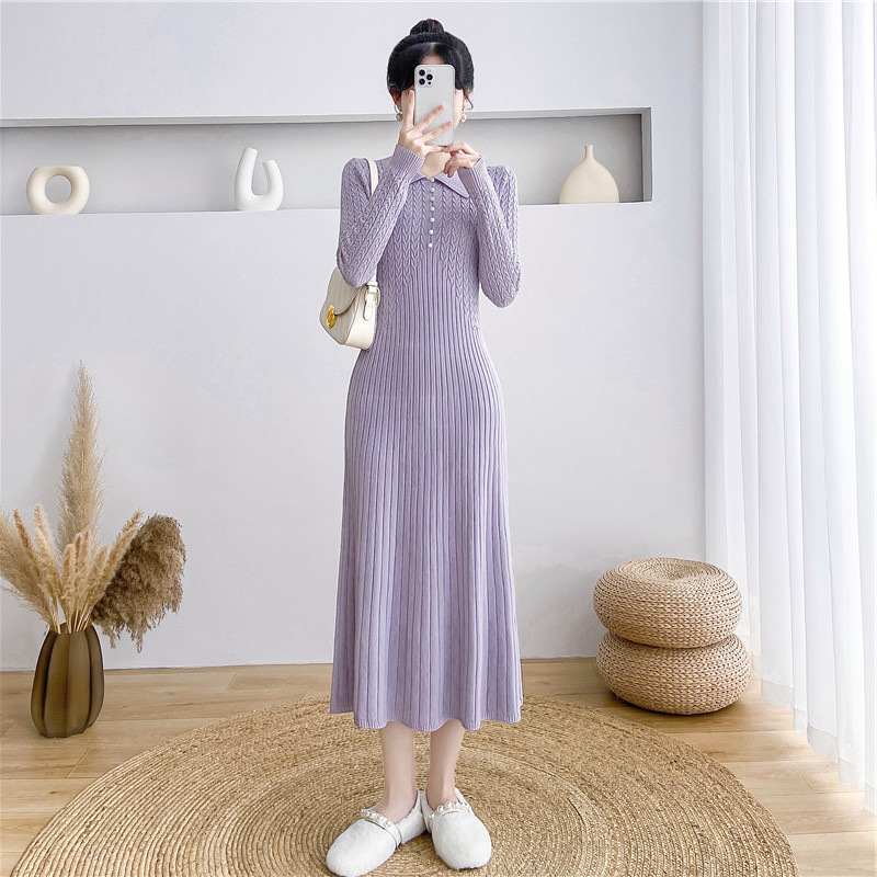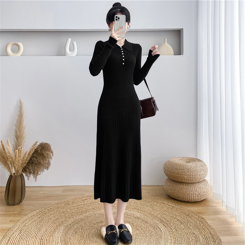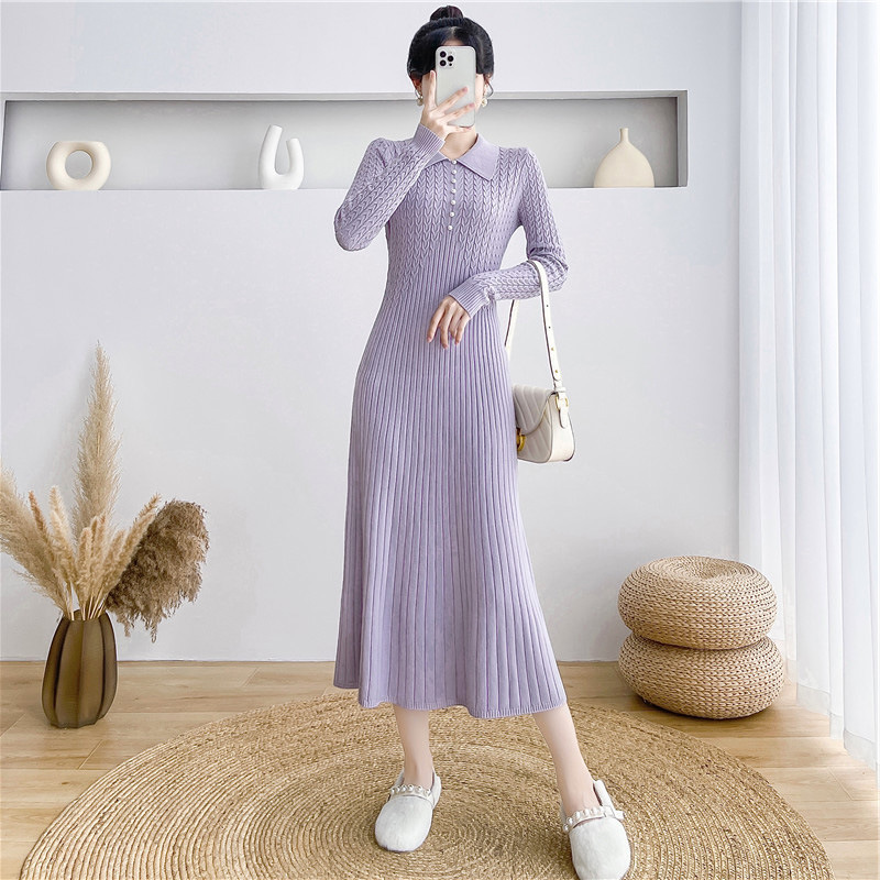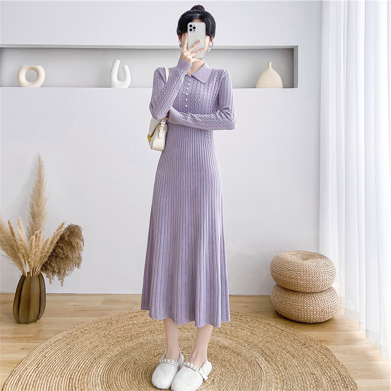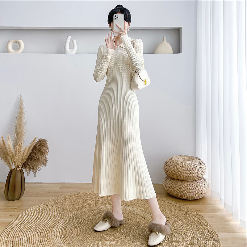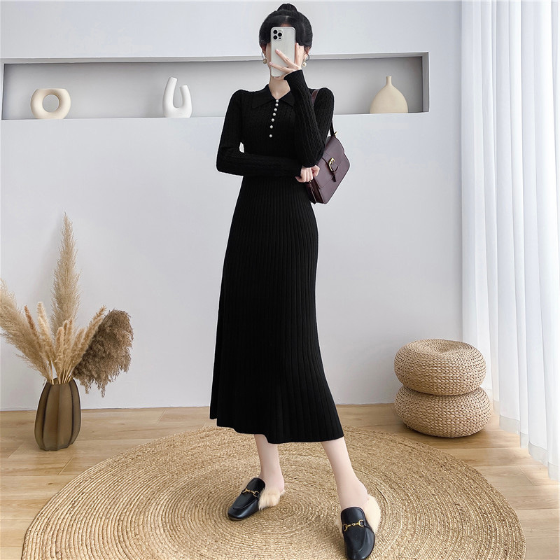 秋冬新款毛衣内搭圆领针织连衣裙女式纯色收腰宽松抽条气质中长裙
