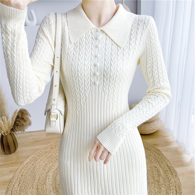 ニットワンピース女子2022秋冬スタイル女装半高襟膝上コートレースニット