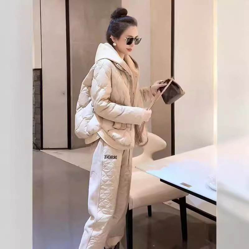 连帽羽绒棉衣女装新短款oversize秋冬季面包服三粒扣格子厚袄外套