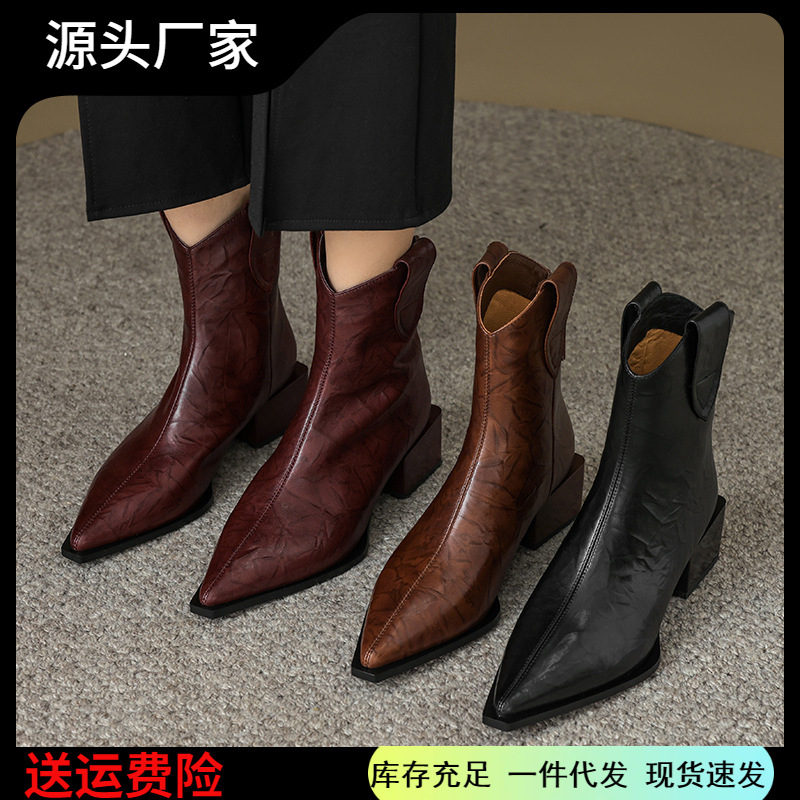 复古高跟短靴女粗跟2024新秋冬法式后拉链短筒气质西部靴尖头裸靴