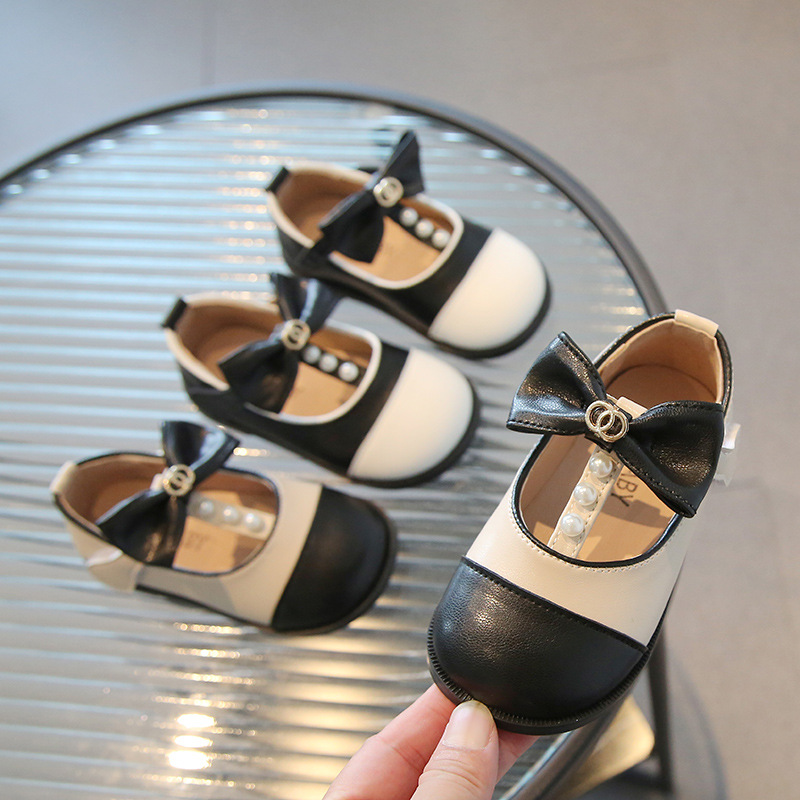 女の子の子供靴2025年春秋新作女の子の真珠蝶結びの王女の靴の子供の柔らかい底の小さい靴のファッション