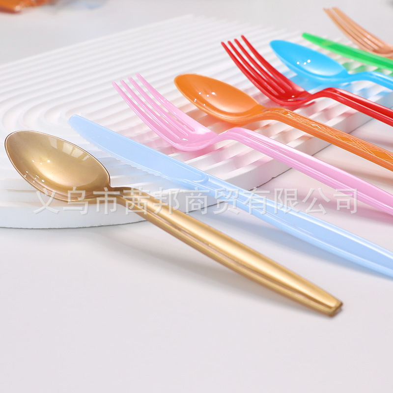 現物デザートケーキフォーク金色食品級psプラスチックフォーク環境保護食器セット使い捨てナイフフォークスプーン