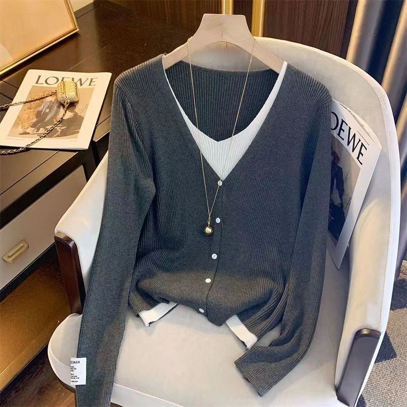 设计感假两件针织开衫外套女式秋装宽松外搭v领拼接软糯毛衣外套