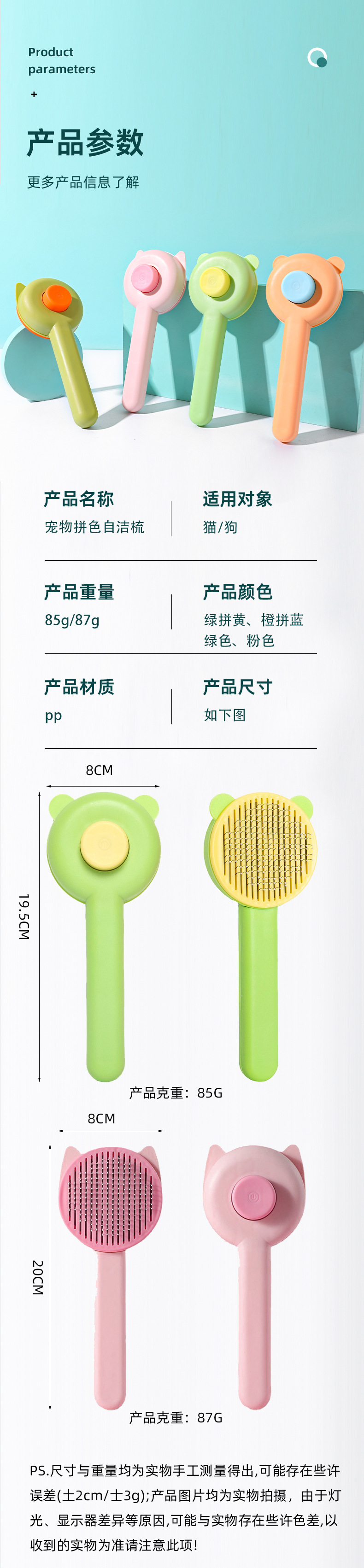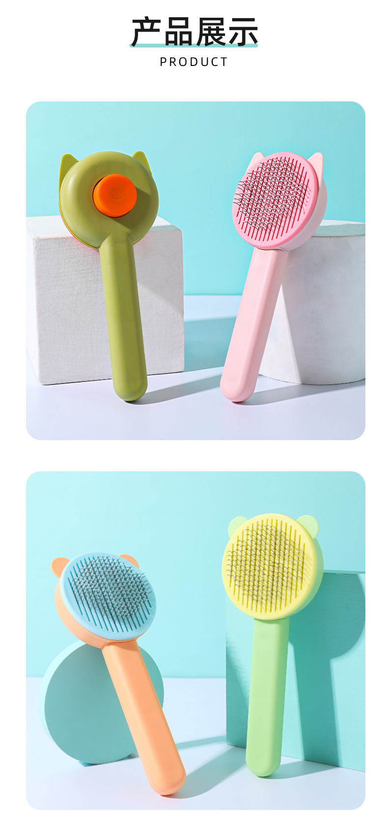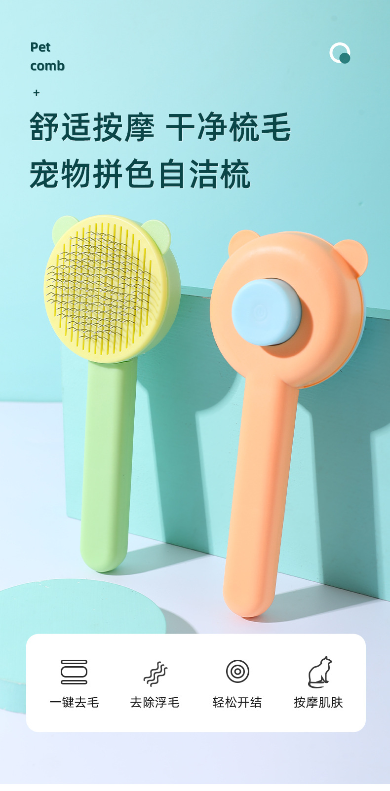 カラーブロックボタン付きベア型セルフクリーニングコーム、ペット用猫コーム、浮毛除去ニードルコーム、猫犬用グルーミング、浮毛除去用品卸売