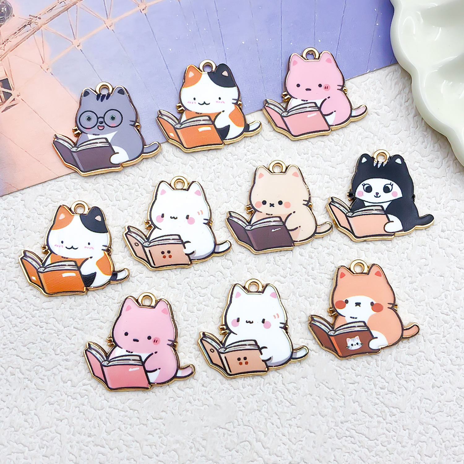 diy ジュエリーアクセサリー読書プリント猫キーホルダーペンダント携帯電話チェーンネックレスイヤリング合金漫画ペンダント