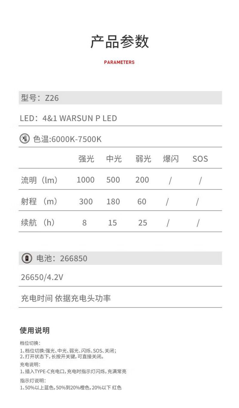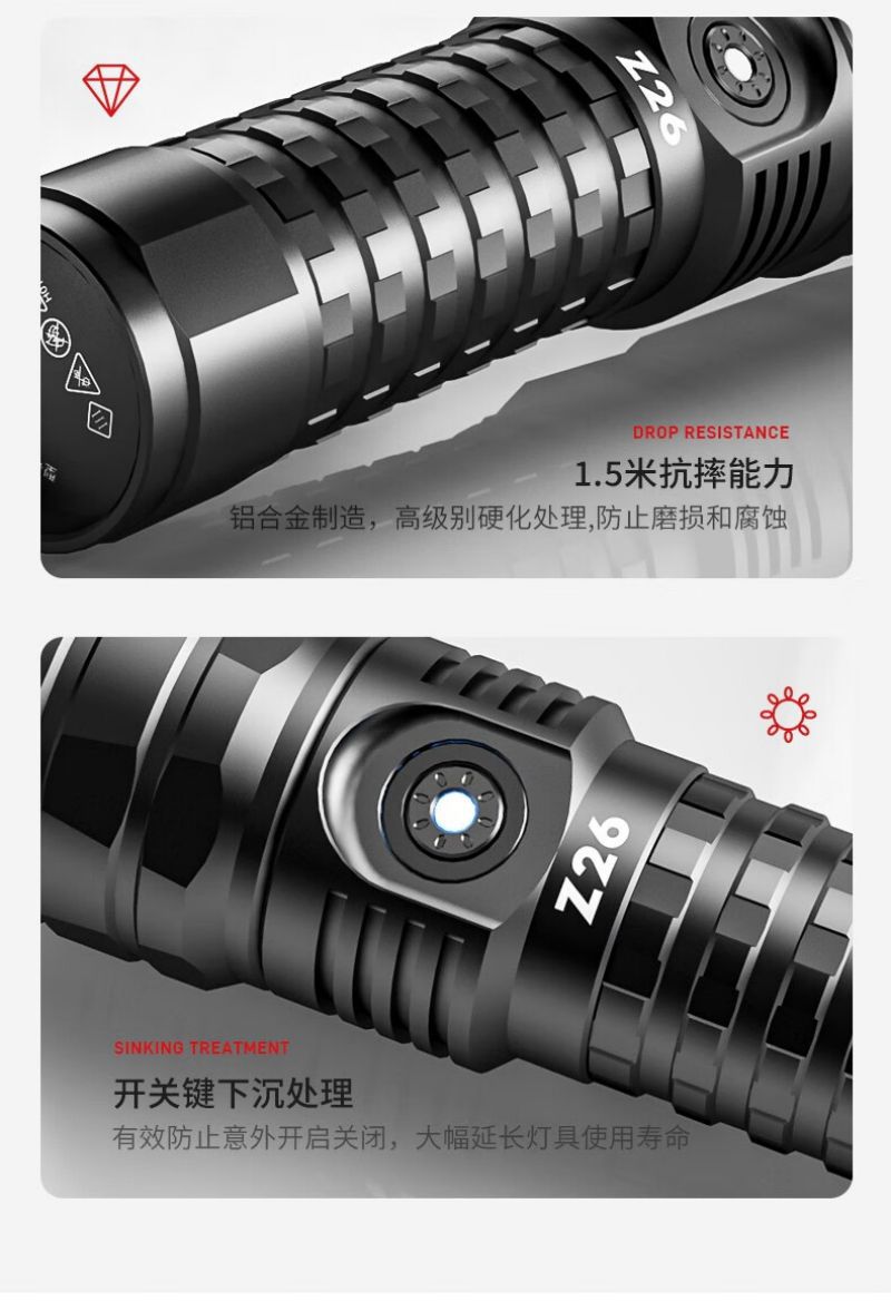 ウォルソンメーカー Z26 強力な光懐中電灯ズーム長距離超高輝度充電式ポータブル屋外照明非常灯
