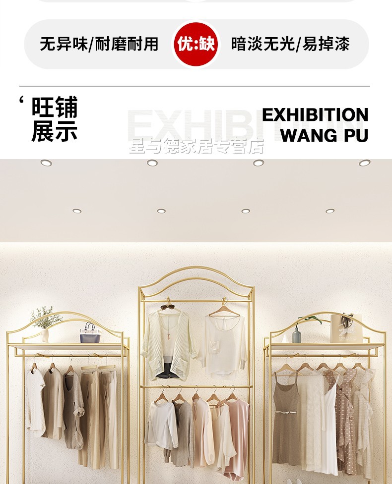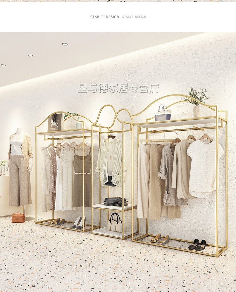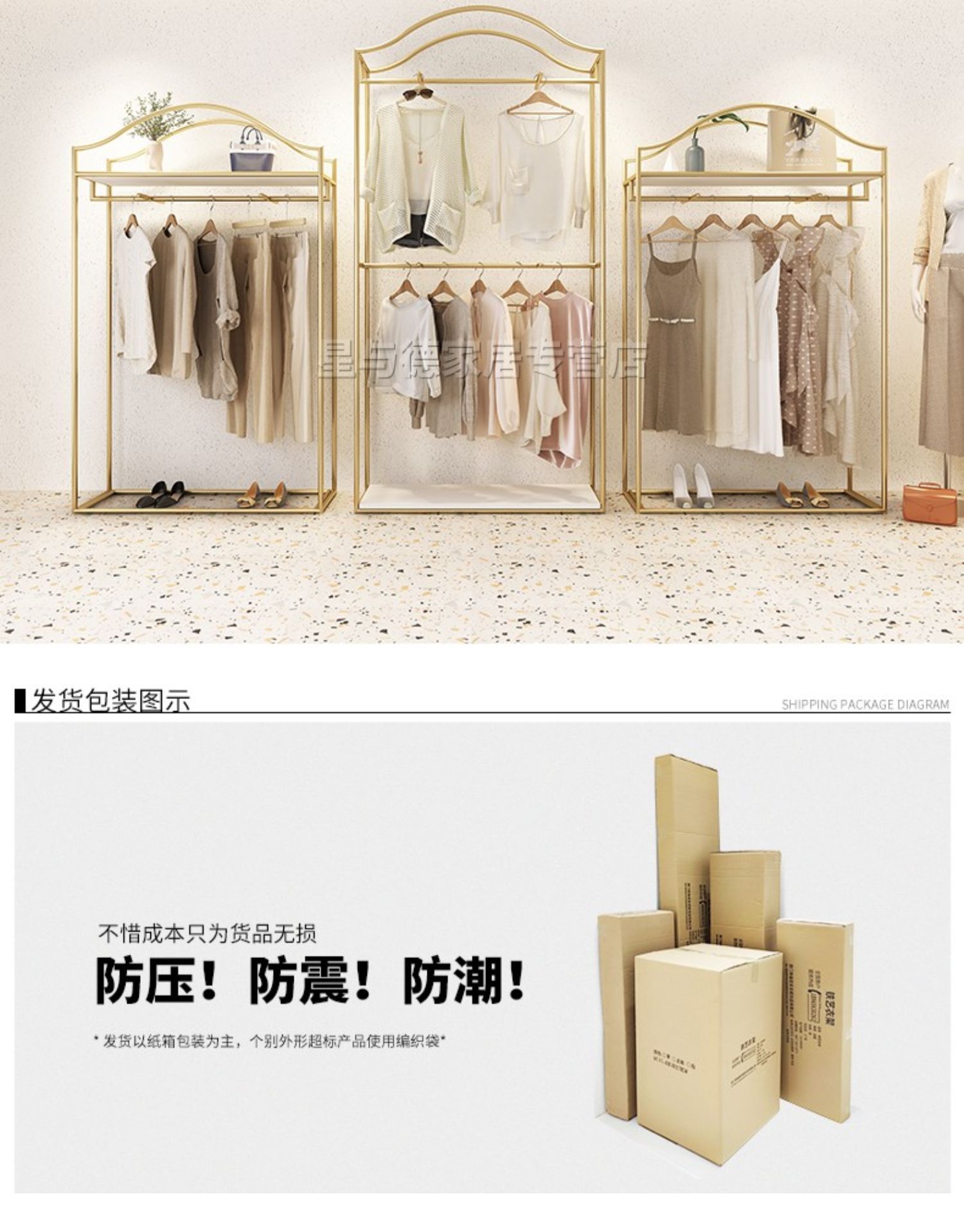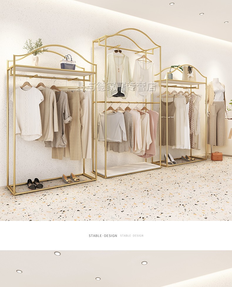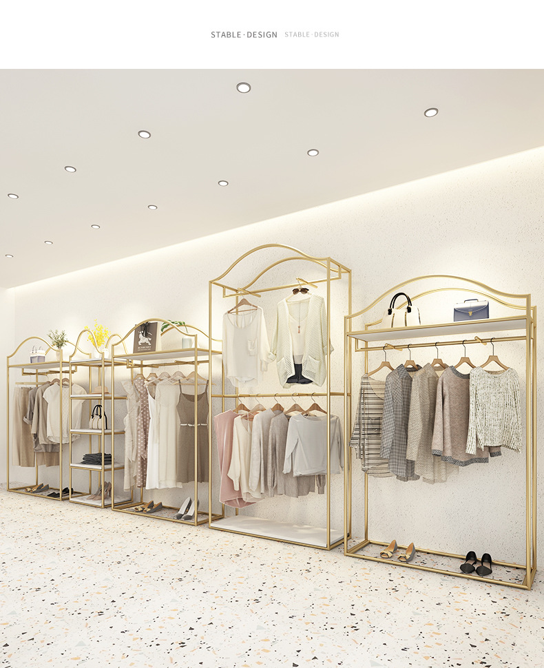 衣料品店の展示棚の二重側は金色の婦人服の棚の高い棚を掛けます。