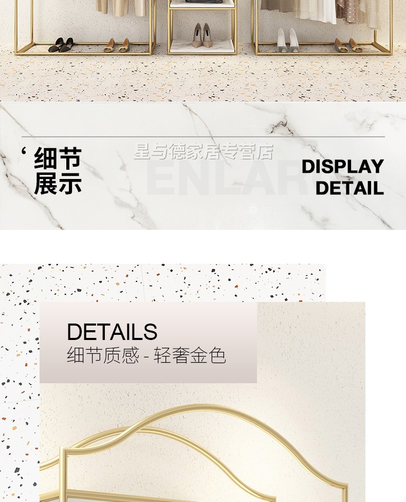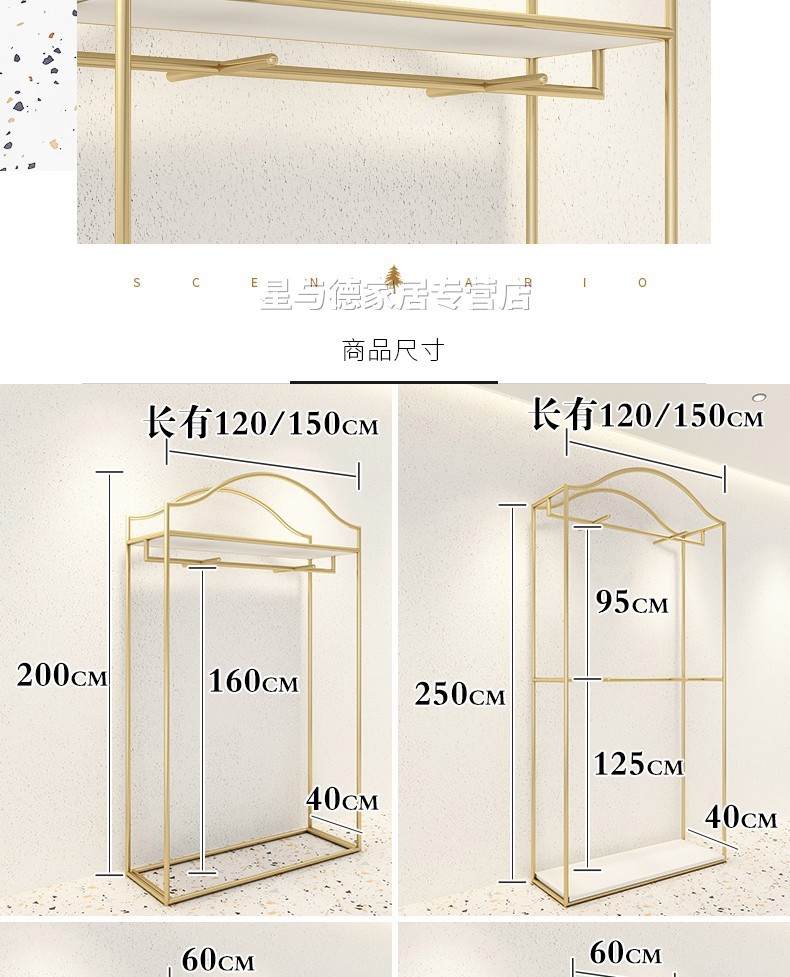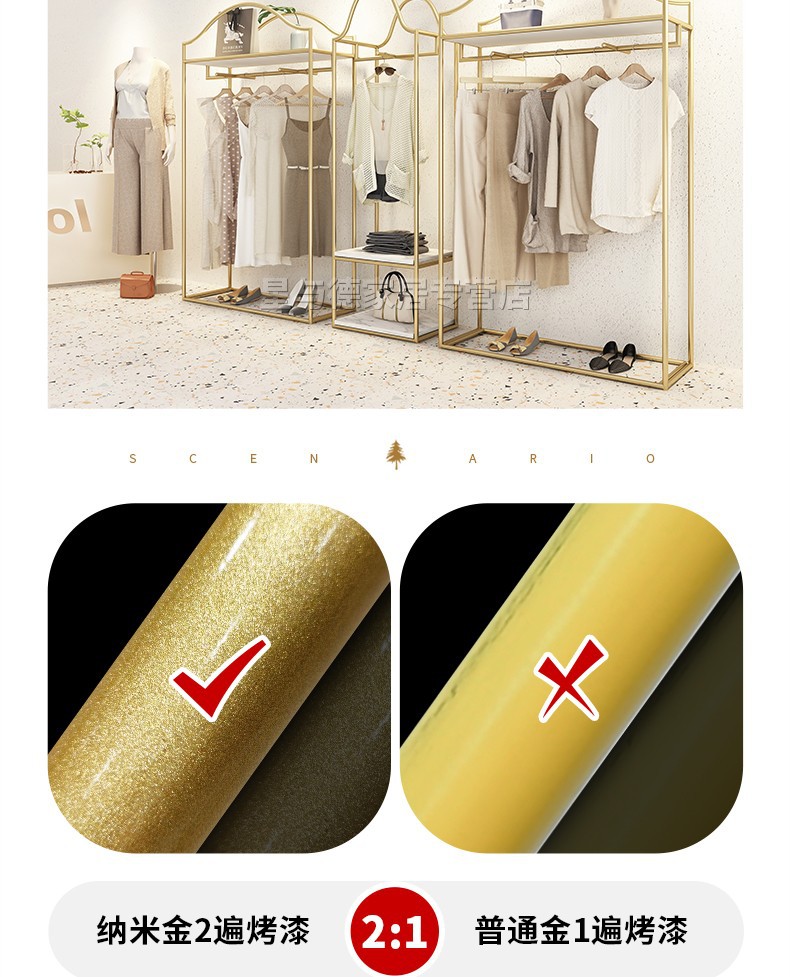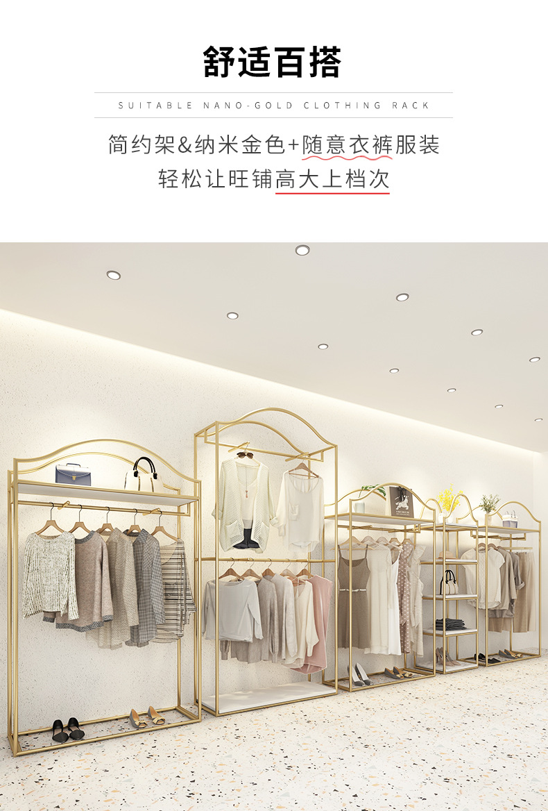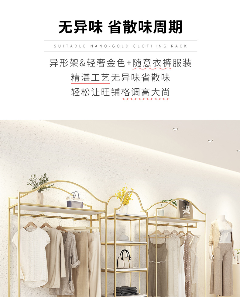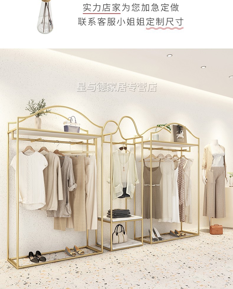 衣料品店の展示棚の二重側は金色の婦人服の棚の高い棚を掛けます。