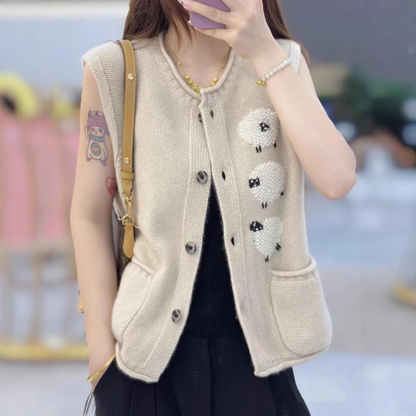 秋冬新款新中式无袖开衫针织马甲背心女圆领叠搭上衣绣花羊毛坎肩