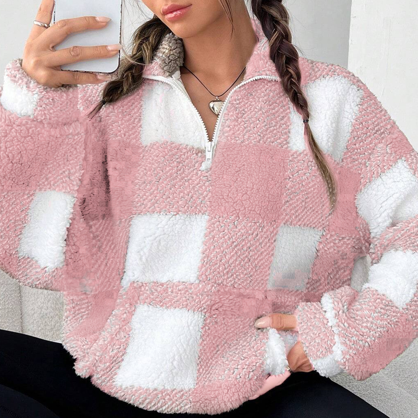 2025欧美跨境秋冬新款拉链格子双面毛绒宽松休闲女装长袖外套