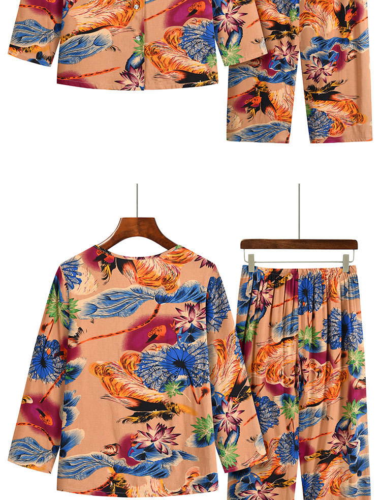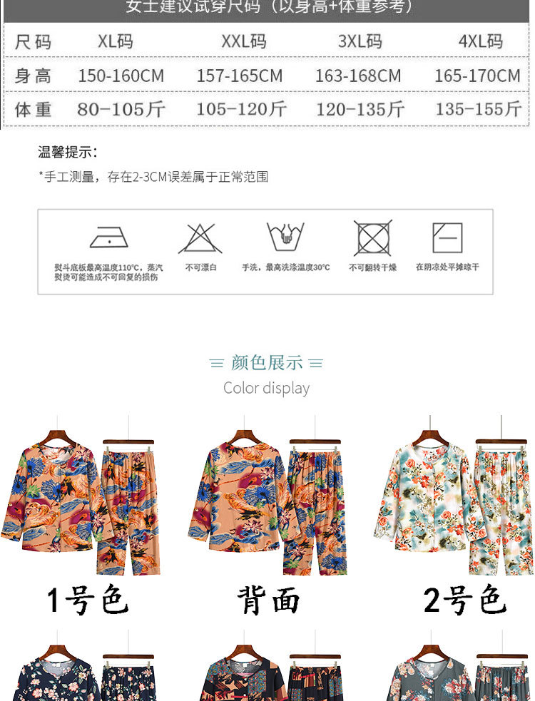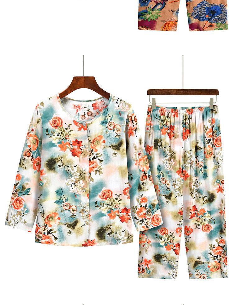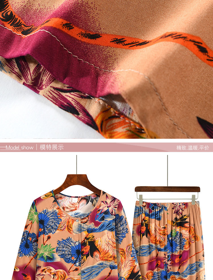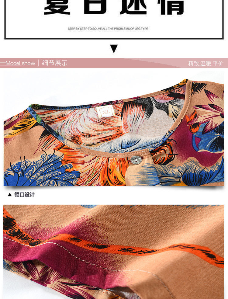おばあちゃんのサマースーツ、コットンシルクカジュアルレディースパジャマ、プリント薄手Tシャツ、ゆったりとしたホームウェア、ママのツーピースセット