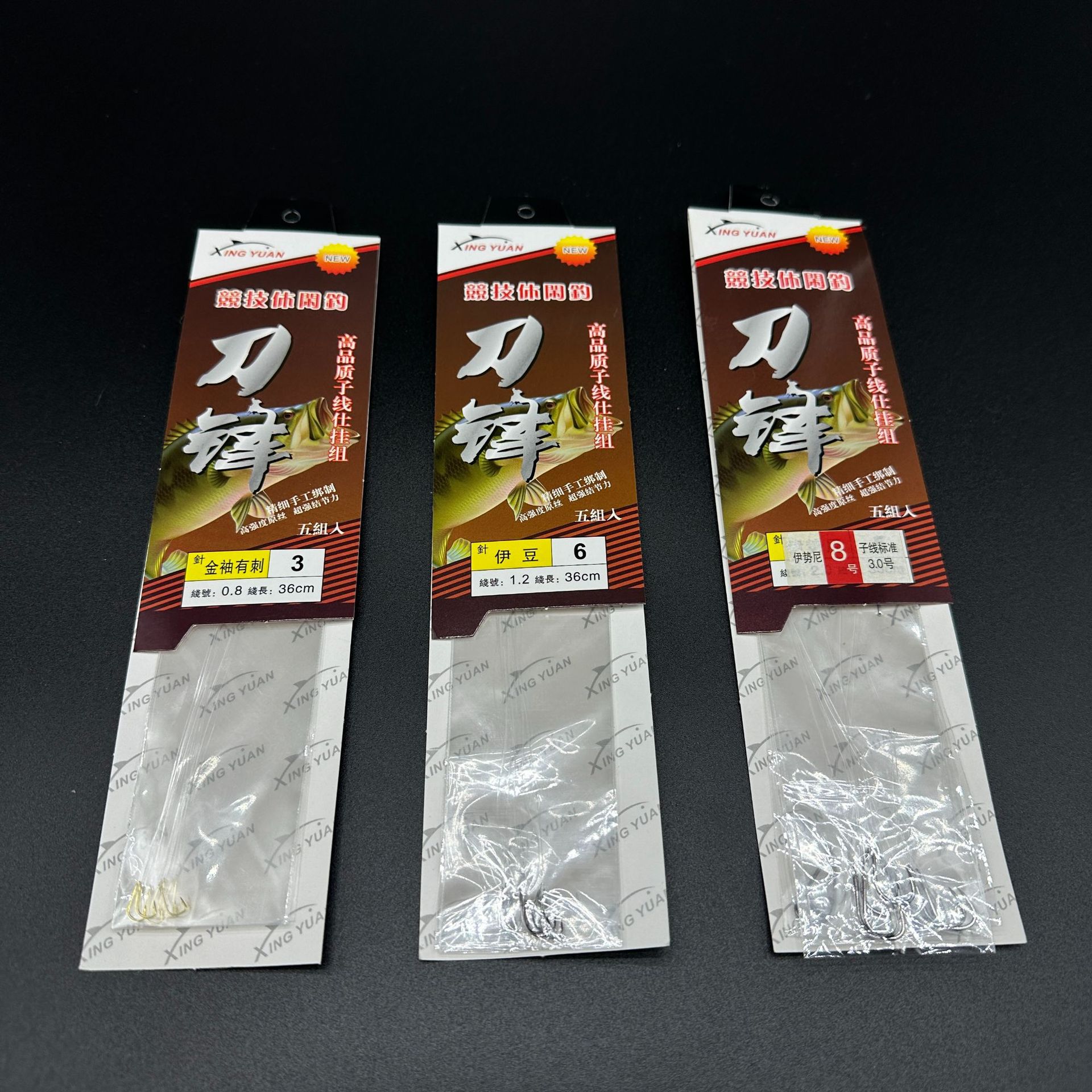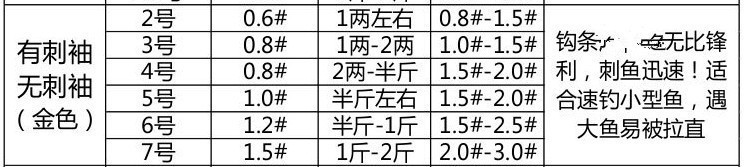 钩型:伊豆1号-10号,金袖有刺1号-6号。金袖无刺1号-6号,本品手工绑制,型号比较多,不明白直接询问客服,