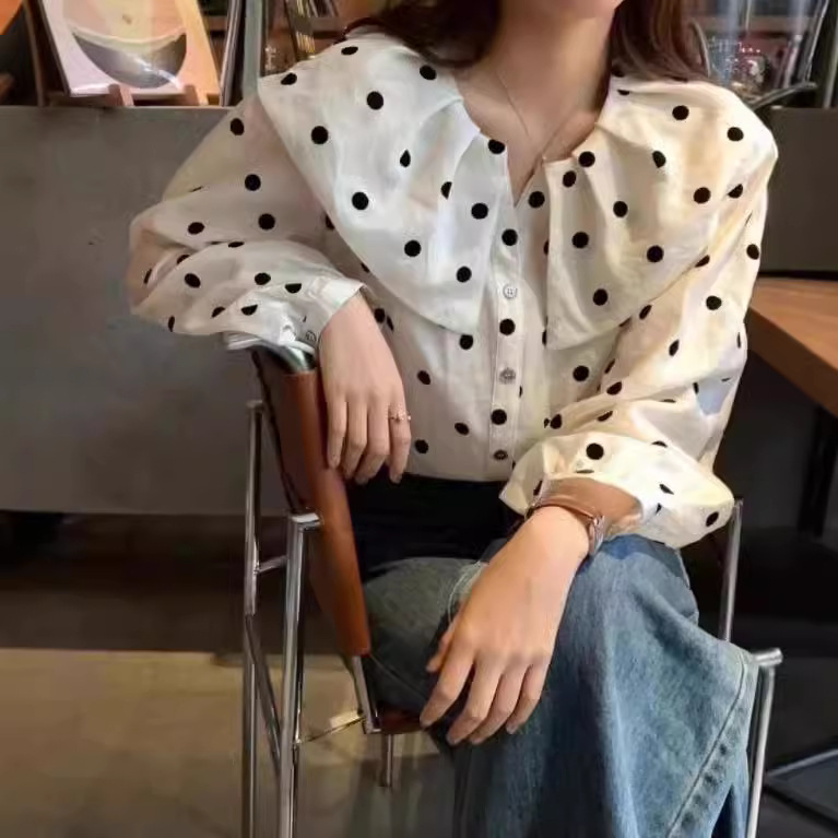 子供の襟の長袖のシャツの女性の2024秋の新型の韓国系の甘い波の点の単列はカジュアルなシャツを掛けます。
