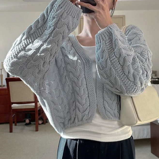 韩国chic秋季小众气质V领麻花纹设计宽松休闲长袖针织开衫毛衣女