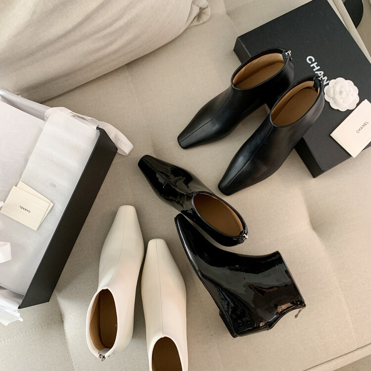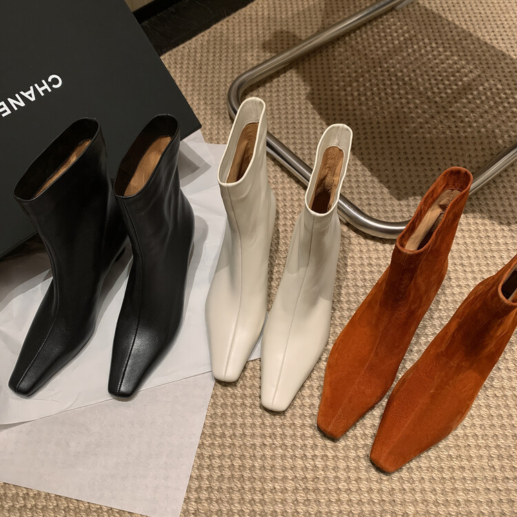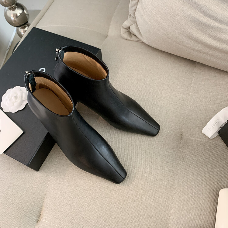 羊皮角頭ショートブーツ女性用シングルブーツ秋冬新作レトロ太ヒールハイヒール痩せ靴後ファスナー本革ブーツ