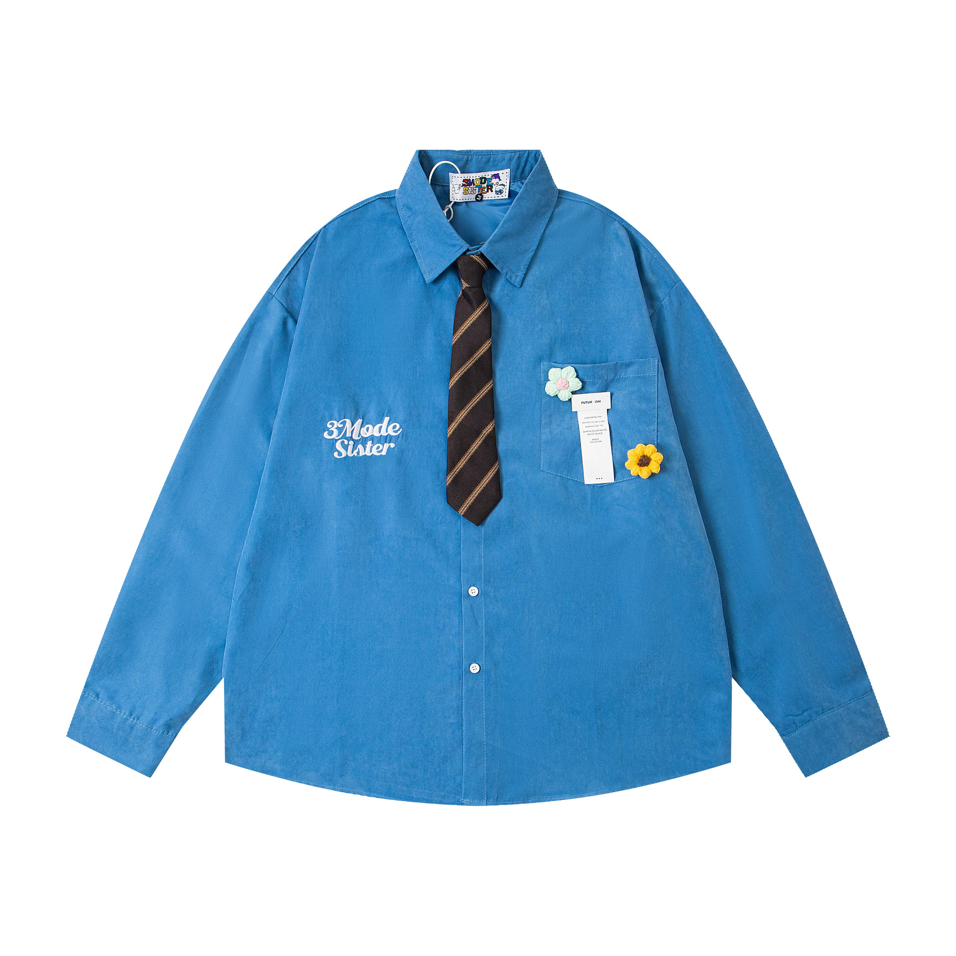 美式复古胸针花刺绣字母长袖衬衫男秋季学院风领带情侣衬衣薄外套