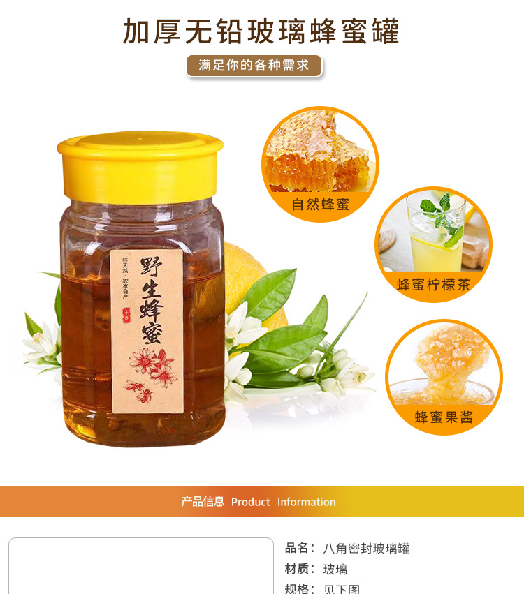八角蜂蜜瓶玻璃蜂蜜罐1斤2斤装蜂蜜瓶子厨房储物罐带盖食品分装瓶
