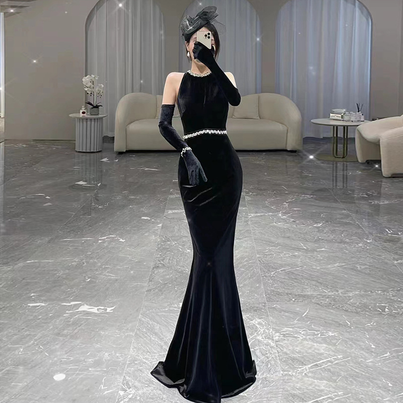 黒のイブニングドレス 女性用 2025年新作 ホルターネック 宴会 エレガント 社交界 ホスト ロング丈 年次総会 細見え マーメイド