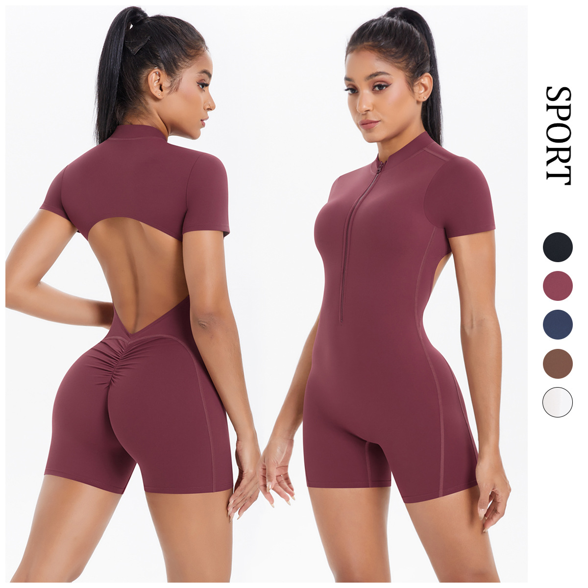 大きなバックレスハーフジッパー半袖ヨガジャンプスーツダンスフィットネスジャンプスーツヌードタイトスポーツジャンプスーツ
