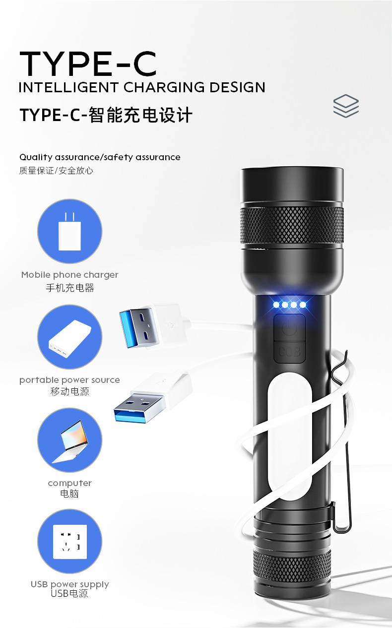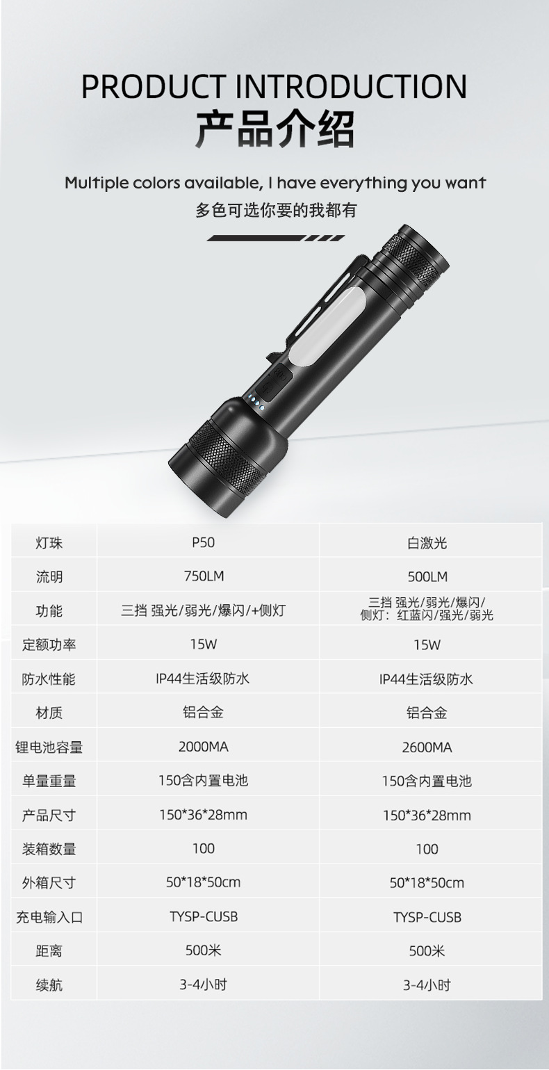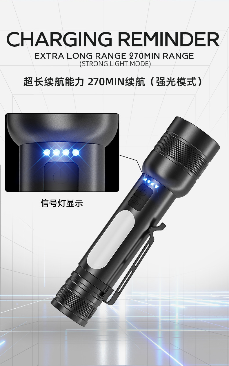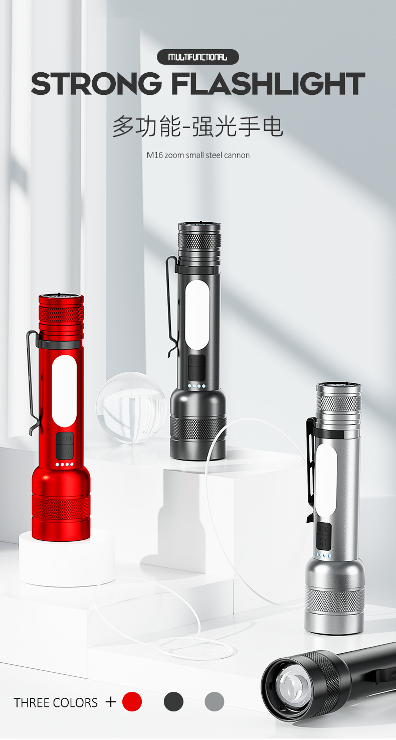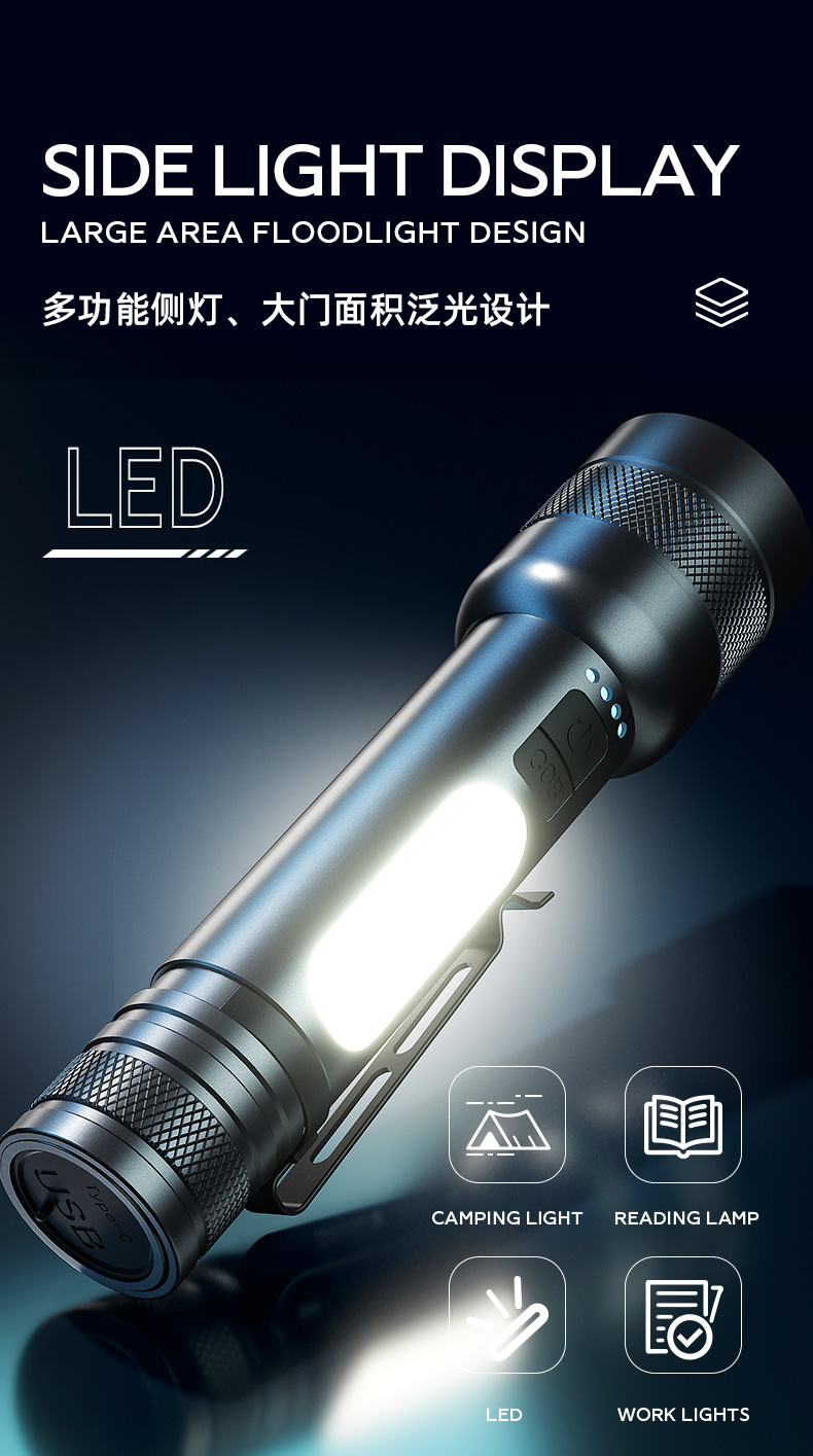 クロスボーダー爆型白レーザー強光サイドライトCOBズームバンド出力屋外多機能三色光源懐中電灯