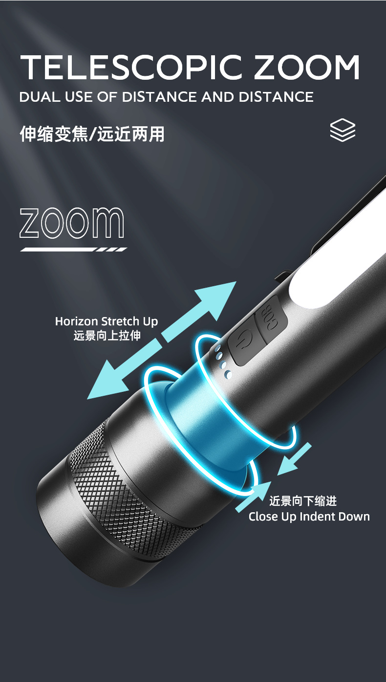 新型led屋外強光充電懐中電灯伸縮ズーム携帯多機能遠射緊急照明懐中電灯