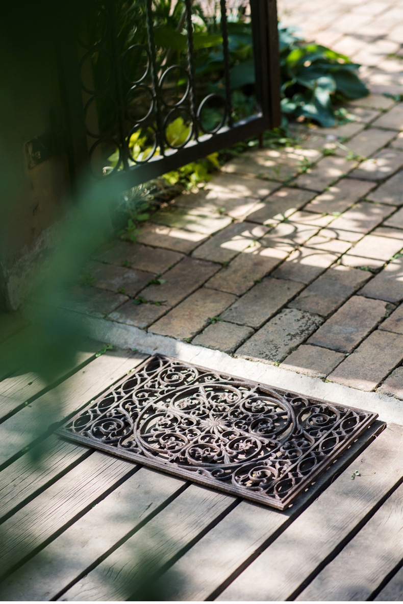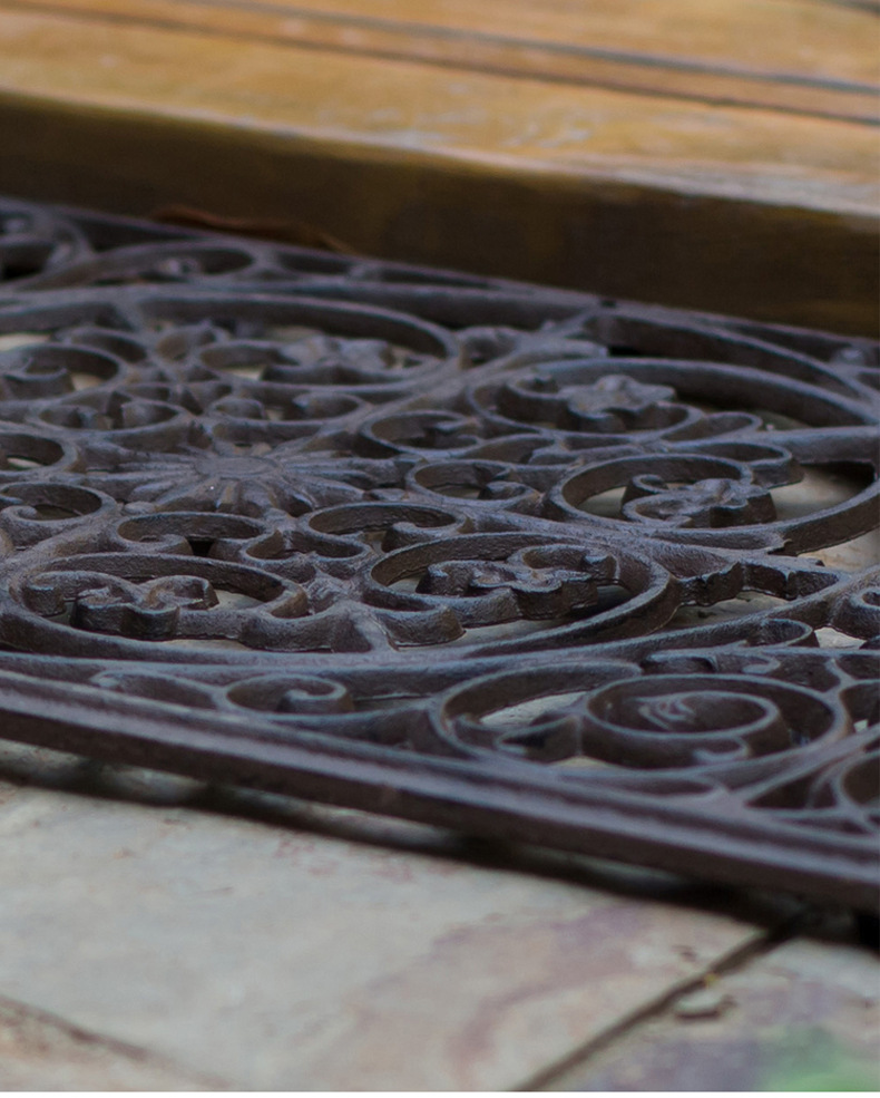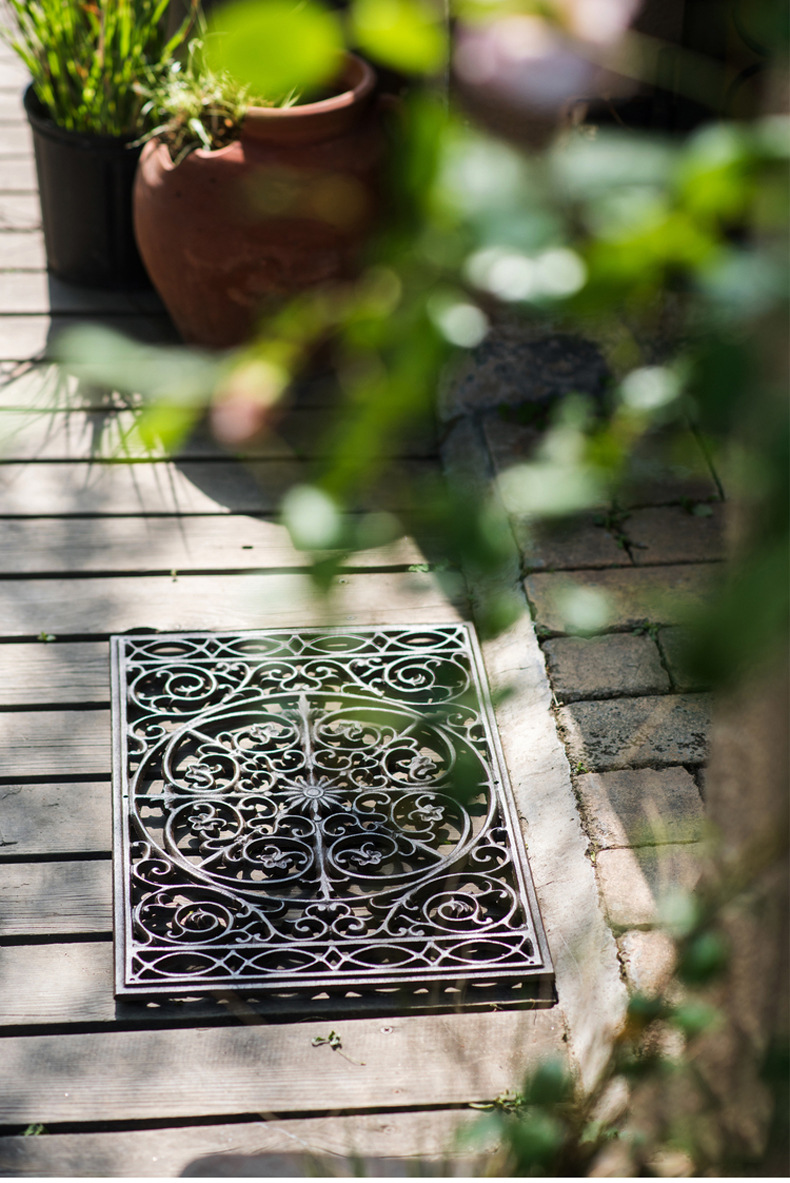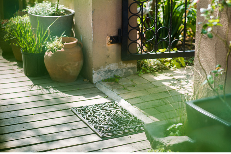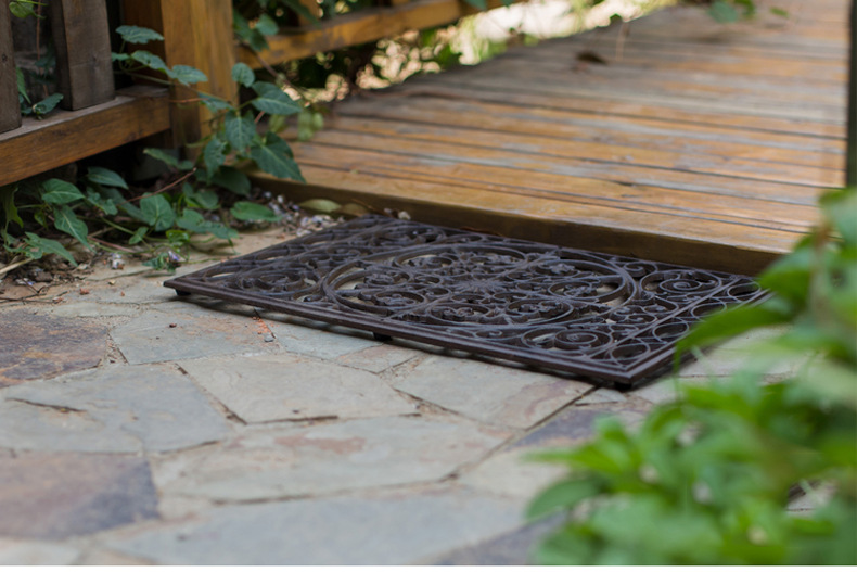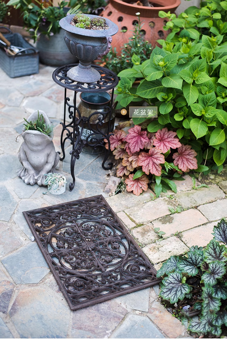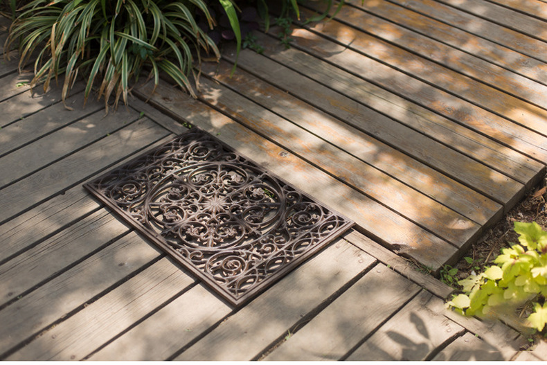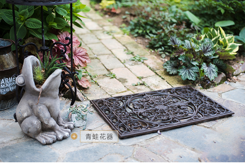ヨーロッパの田舎のレトロな鋳鉄の足のマットのドアは別荘の花園の庭の扉の前の鋳鉄の装飾品の置物のマットを踏みます。