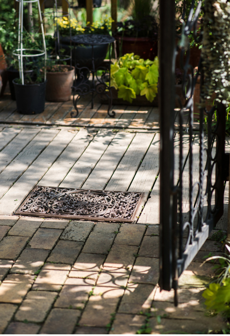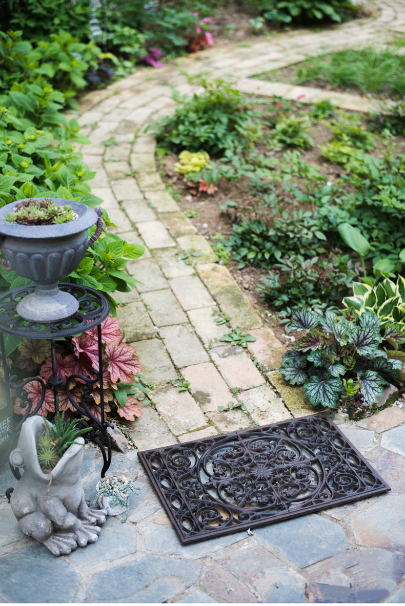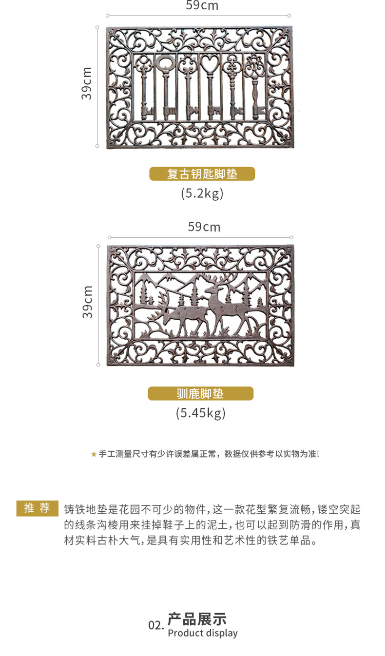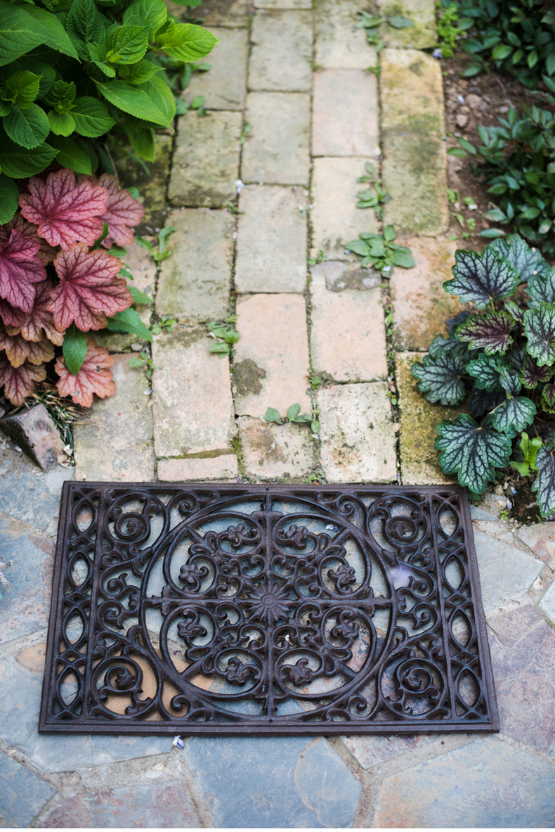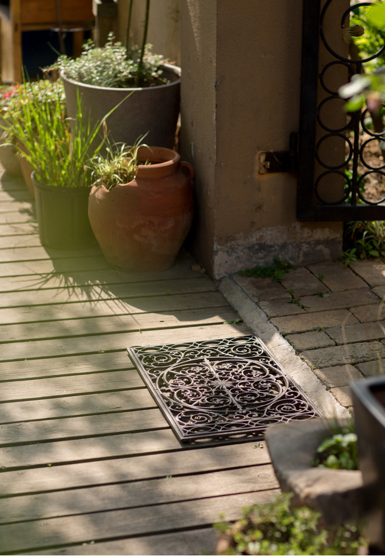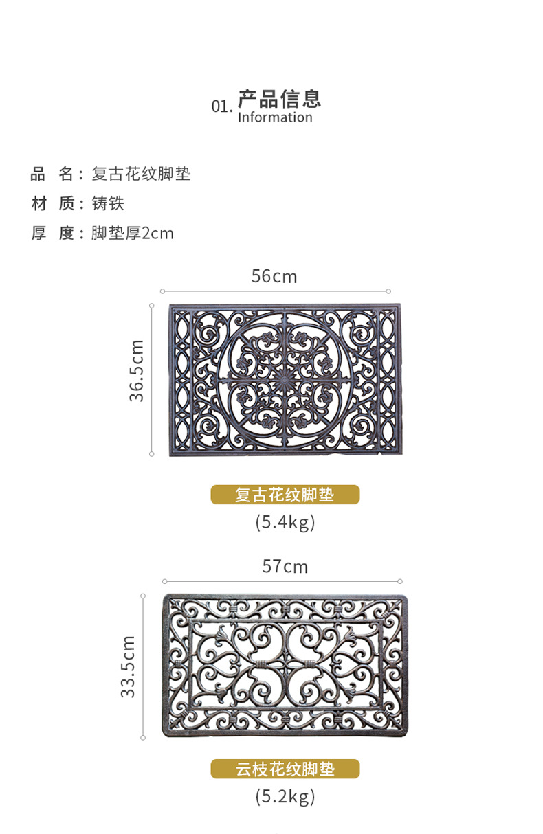 ヨーロッパの田舎のレトロな鋳鉄の足のマットのドアは別荘の花園の庭の扉の前の鋳鉄の装飾品の置物のマットを踏みます。