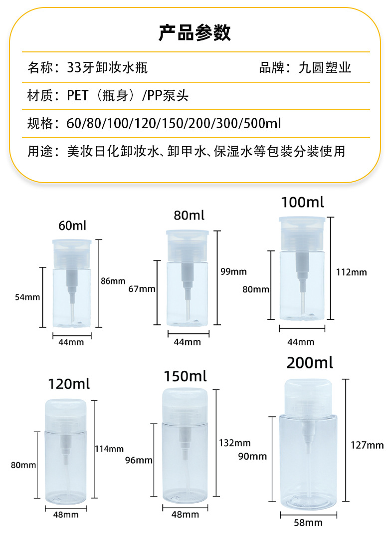 100ml、120ml、150ml、200mlのプレス式メイク落としボトル、ネイルリムーバーボトル、マニキュアボトル、詰め替えボトル