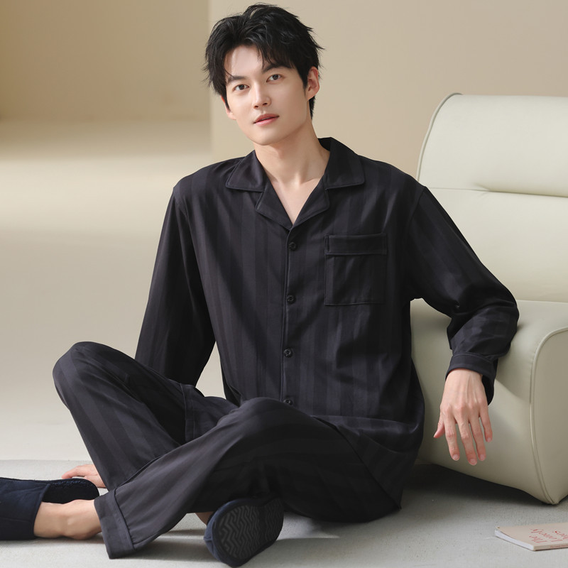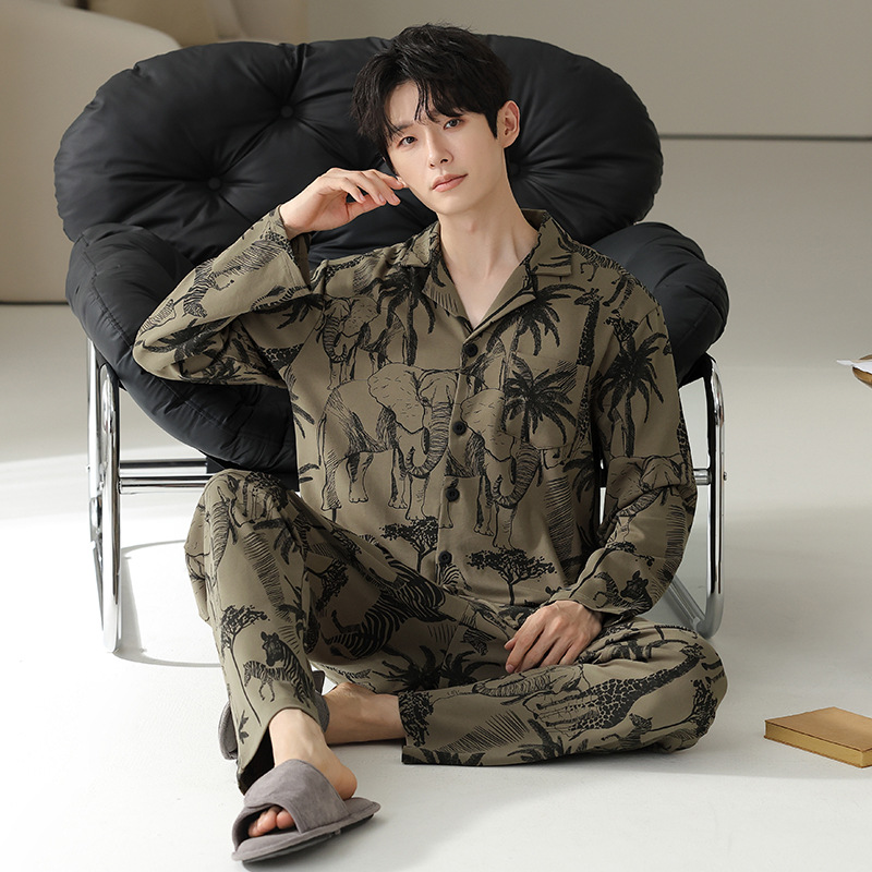 新しい春秋ホテル風男性パジャマ長袖ゆるい通気性ニット両面綿襟付きホームパジャマ