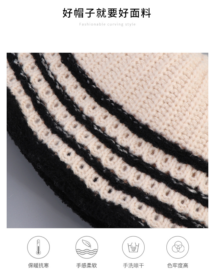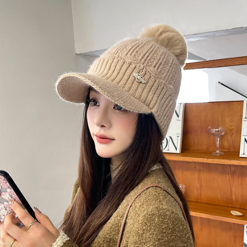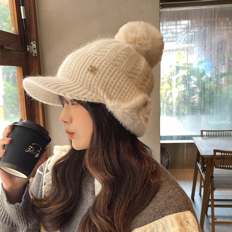 韓国版の新しい秋と冬の毛玉かわいいニットつばの短いひさしキャップ女性の耳保護厚く暖かく防寒ウール帽子