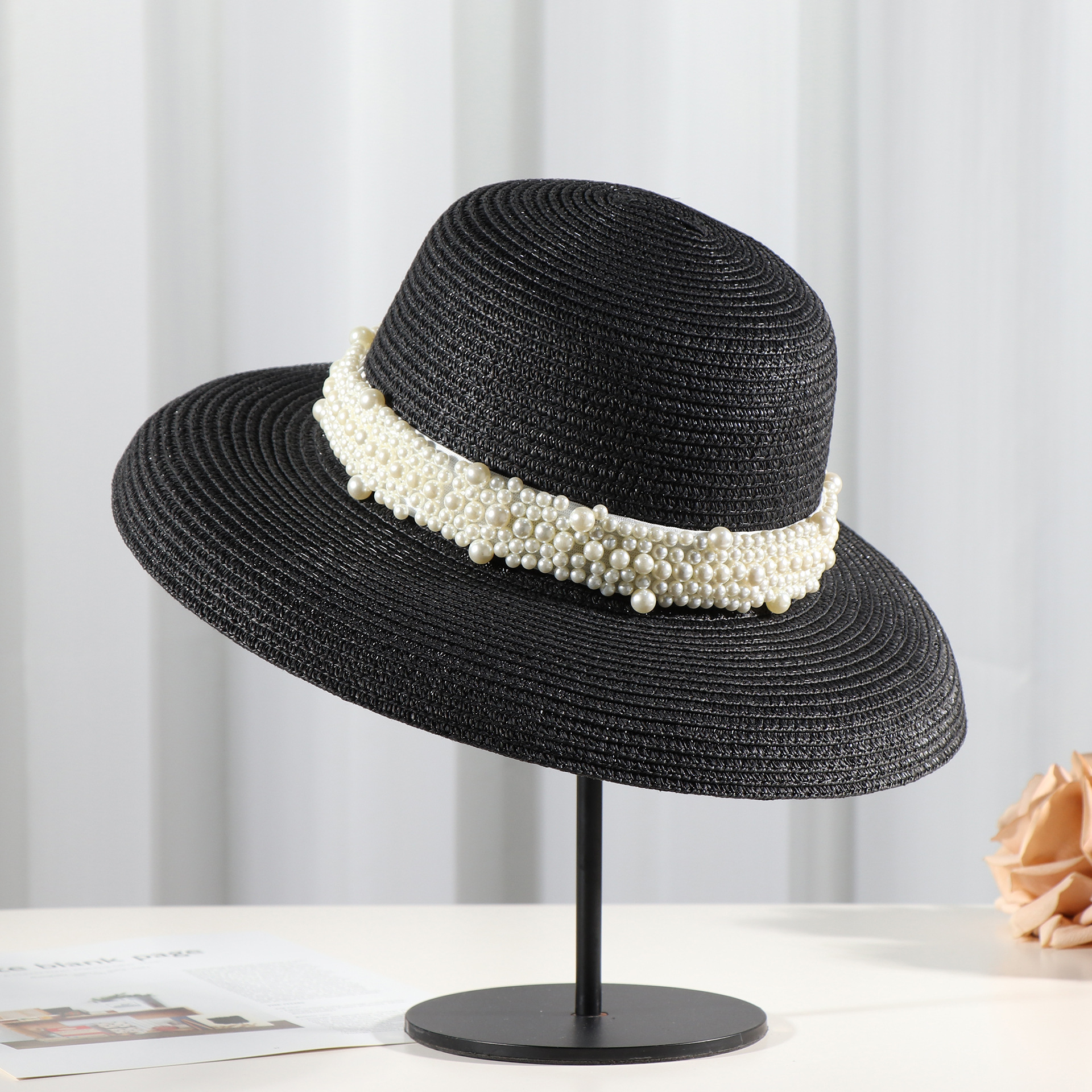 卸売新しい大きなつばの麦わら帽子女性のための夏フレンチヘップバーンスタイルレトロドームパールサンシェード帽子多用途