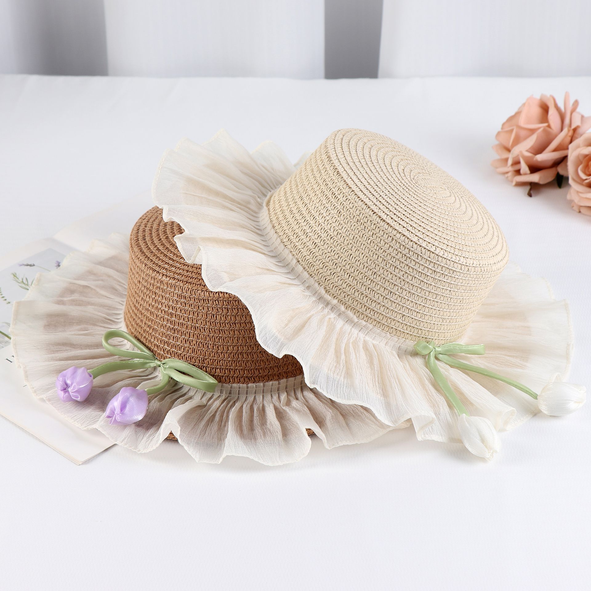 卸売韓国スタイルの新しい夏の麦わら帽子女性の日焼け止めフラットトップ帽子旅行ファッションメッシュプリンセススタイル帽子トレンド