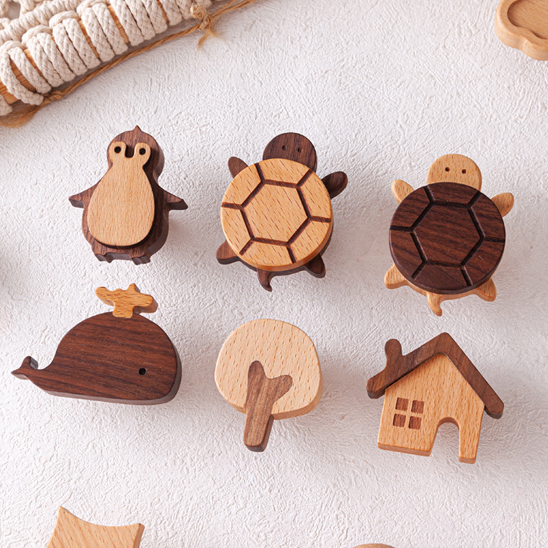 儿童房衣柜拉手木质卡通乌龟鲸鱼房子柜子抽屉原木色柜门把手