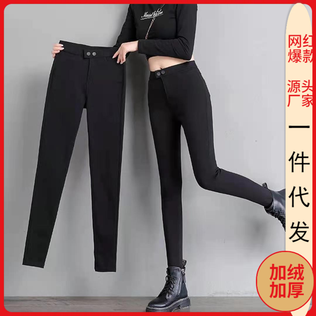 裏起毛厚手猫柄マジックパンツ レディース 冬用 ハイウエスト スリム 細見え 黒パンツ 薄手三つボタン 保温 レギンス