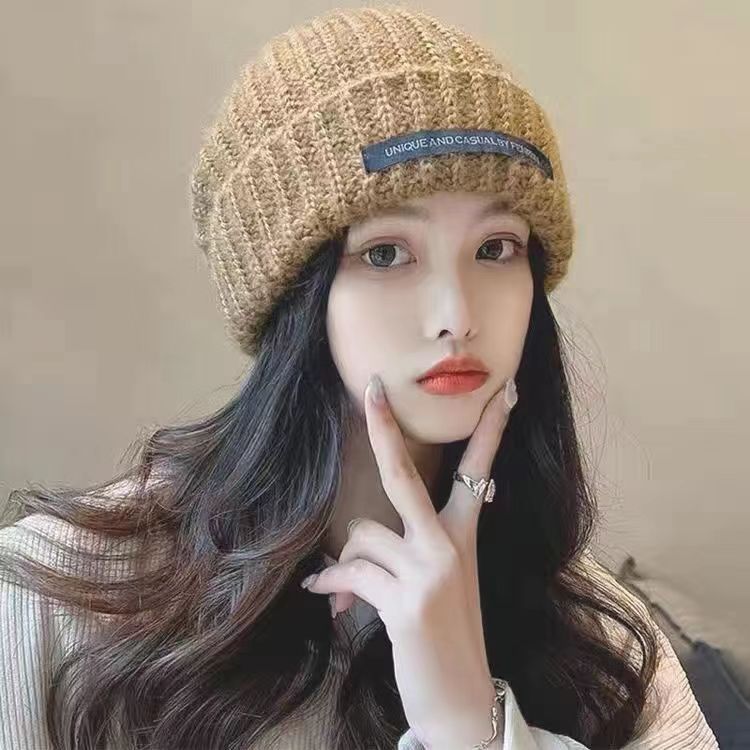 韓国版のアルファベットの布の標識の厚いニットの毛糸の帽子の女性の冬の大きい頭の周りの帽子は顔の小さい耳の帽子を現して保温します。