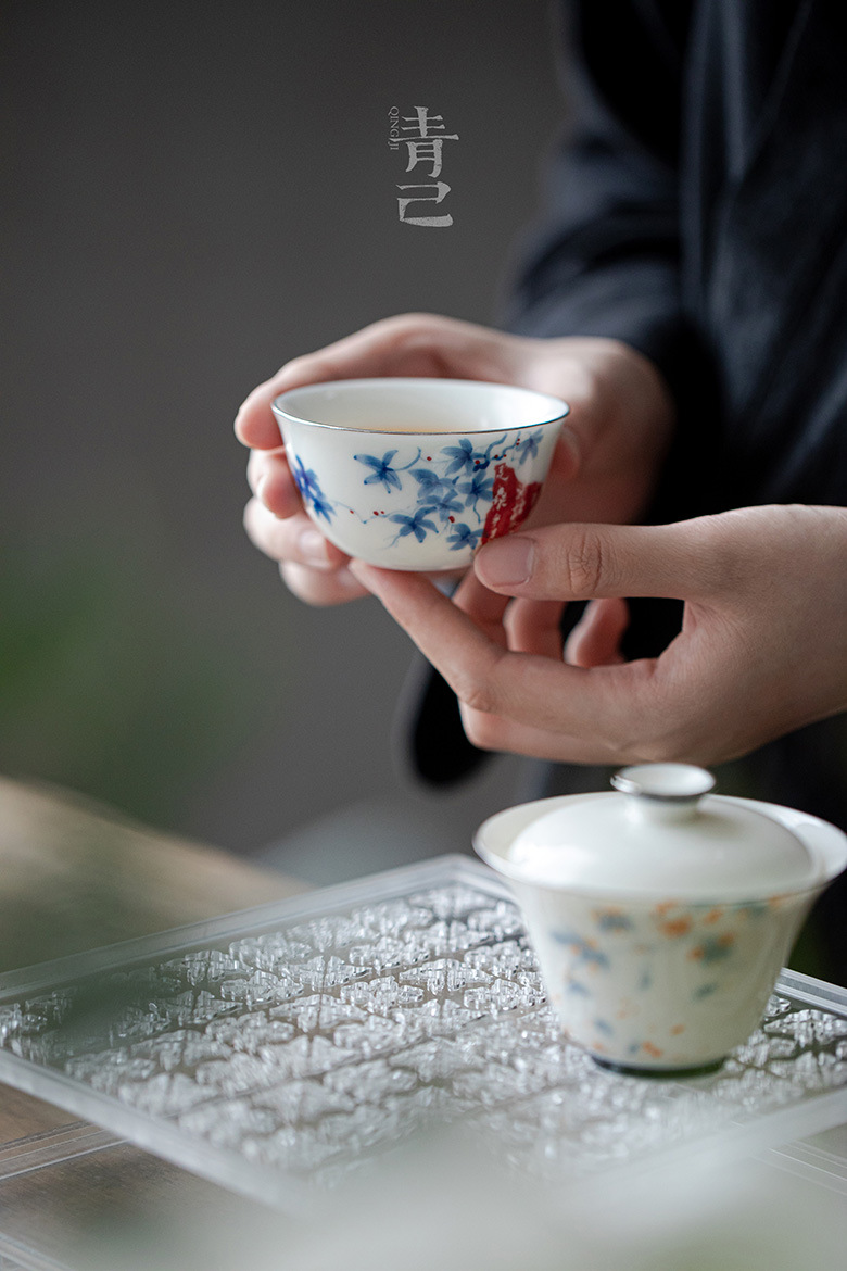 青己玉泥青花手描きティーカップカンフーティーカップ釉薬下彩陶磁器萍跡雅歌品茗杯